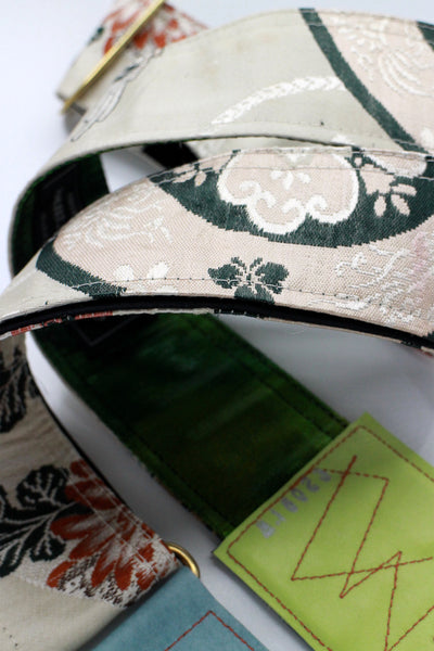 Each has a unique, hand-stamped serial number. All are handmade in Kyoto from recycled vintage silk kimono obis and repurposed leather off-cuts.
