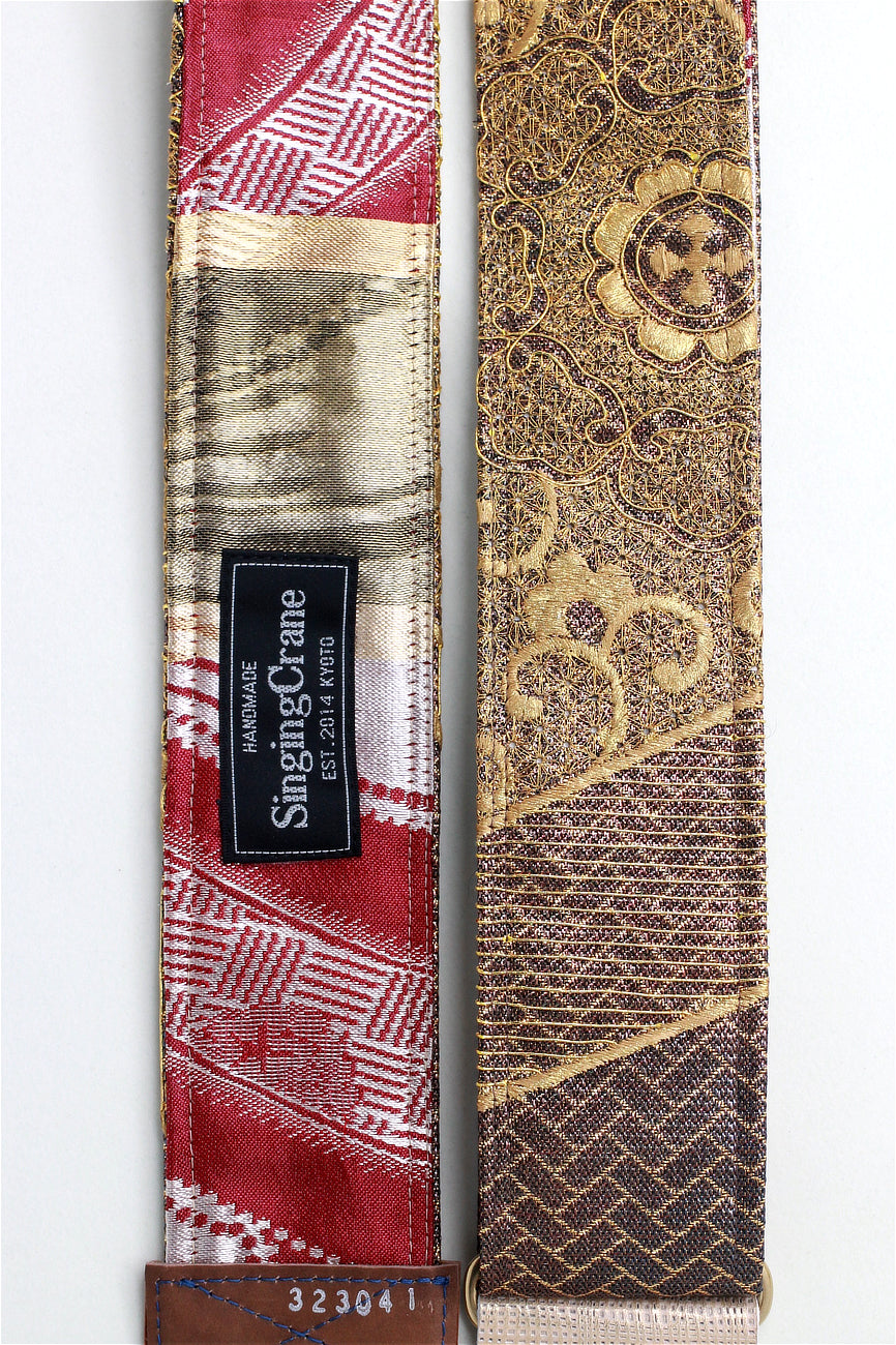 Every Singing Crane strap is one-of-a-kind, one of three variations from the same Obi on the front, and this strap has a red reverse, with hand picked matching leathers and stitching.