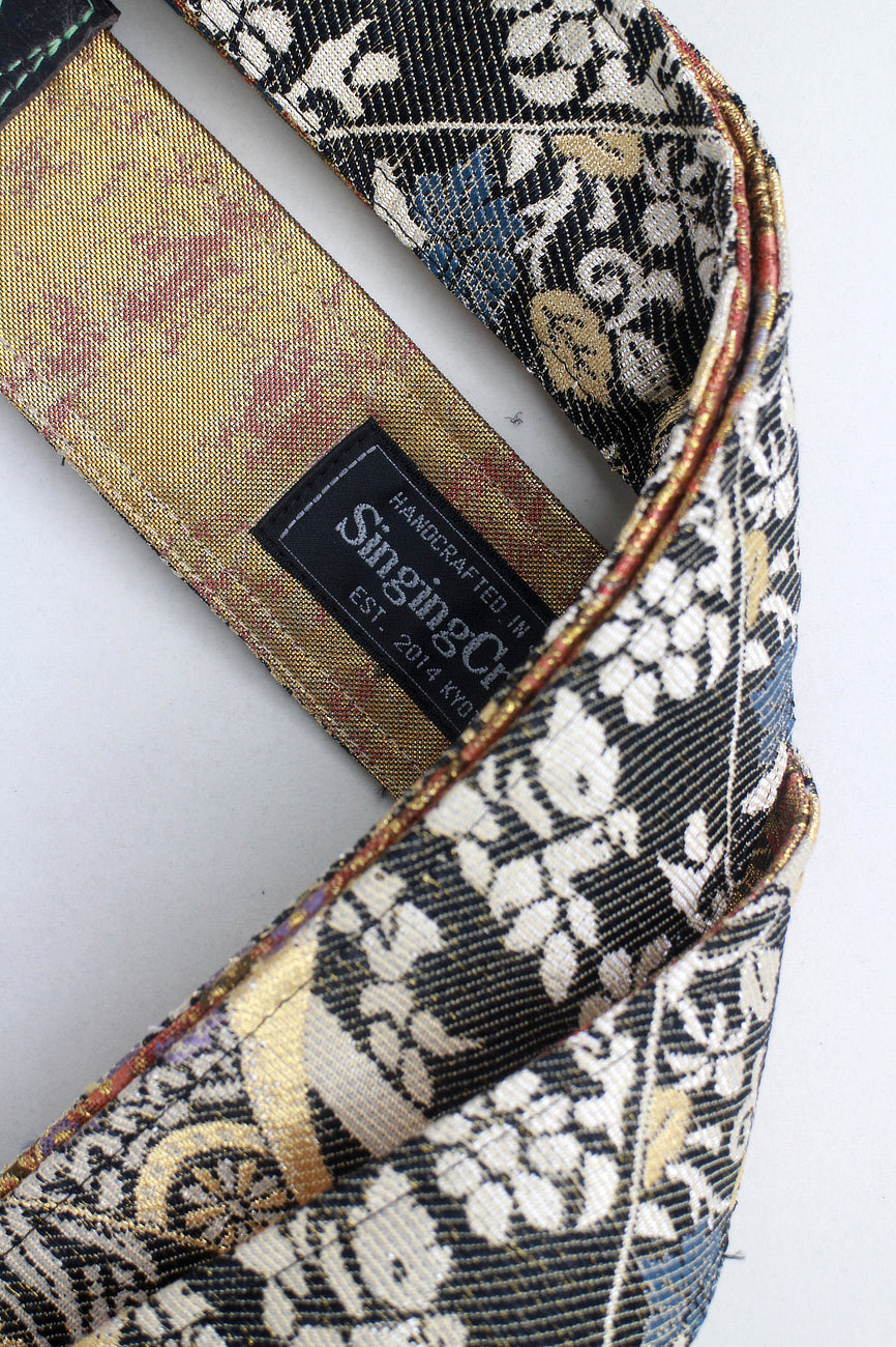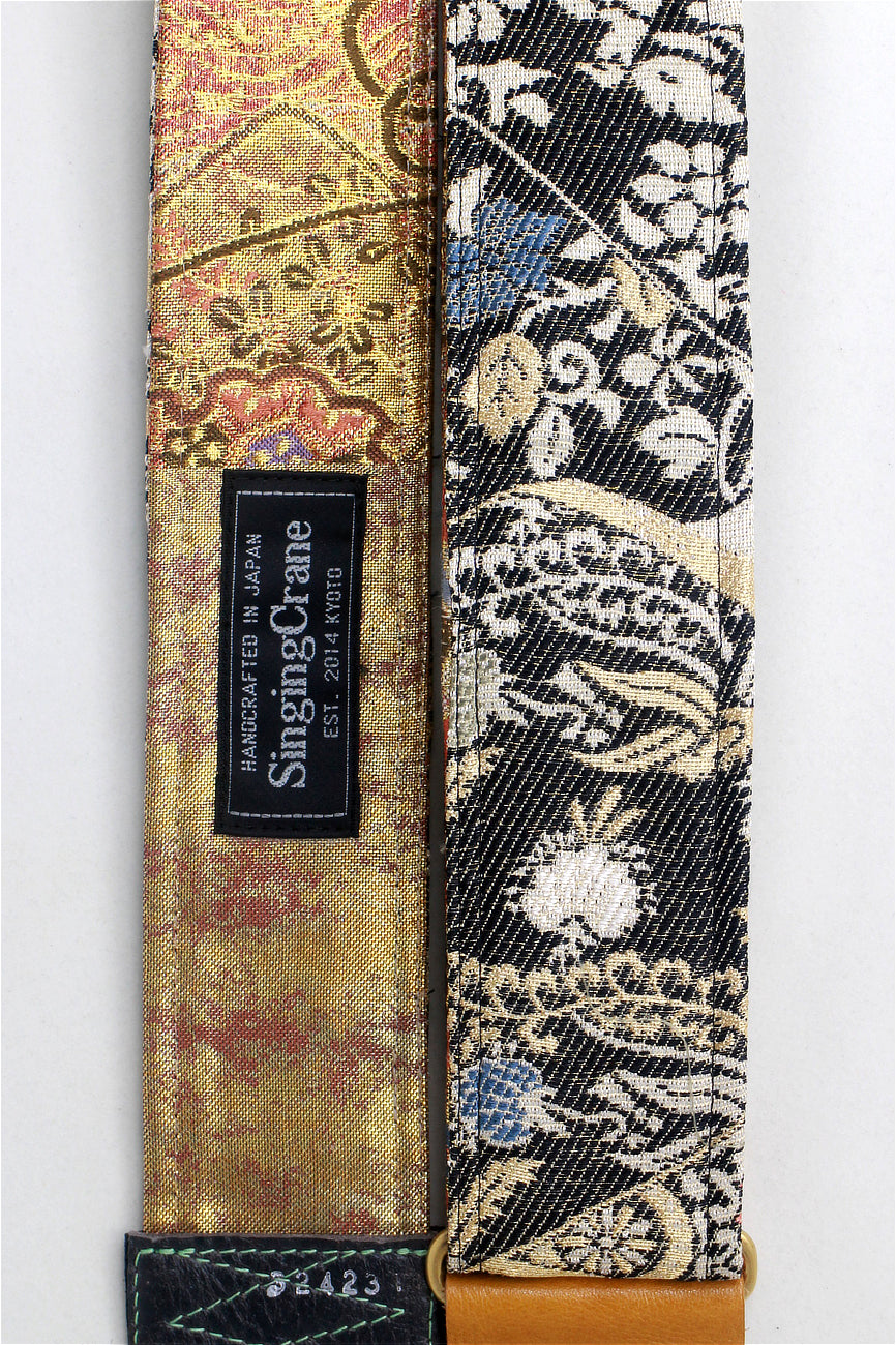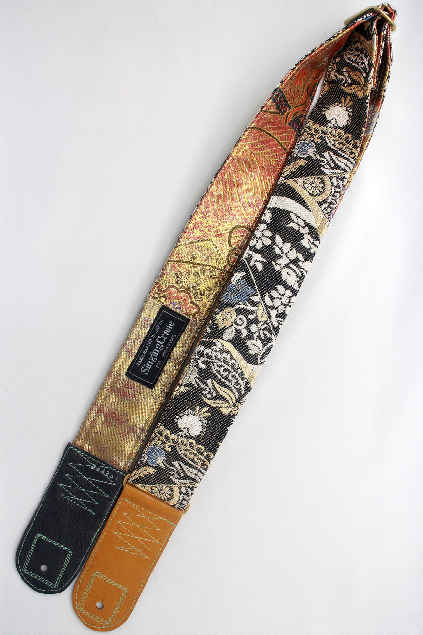 Every Singing Crane strap is one-of-a-kind, one of three variations from the same Obi on the front, and this strap has an antique gold colour reverse, with hand picked matching leathers and stitching.