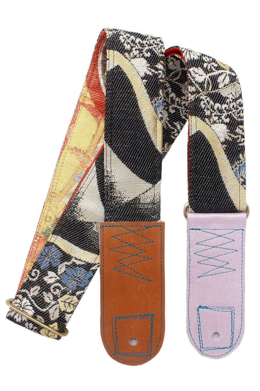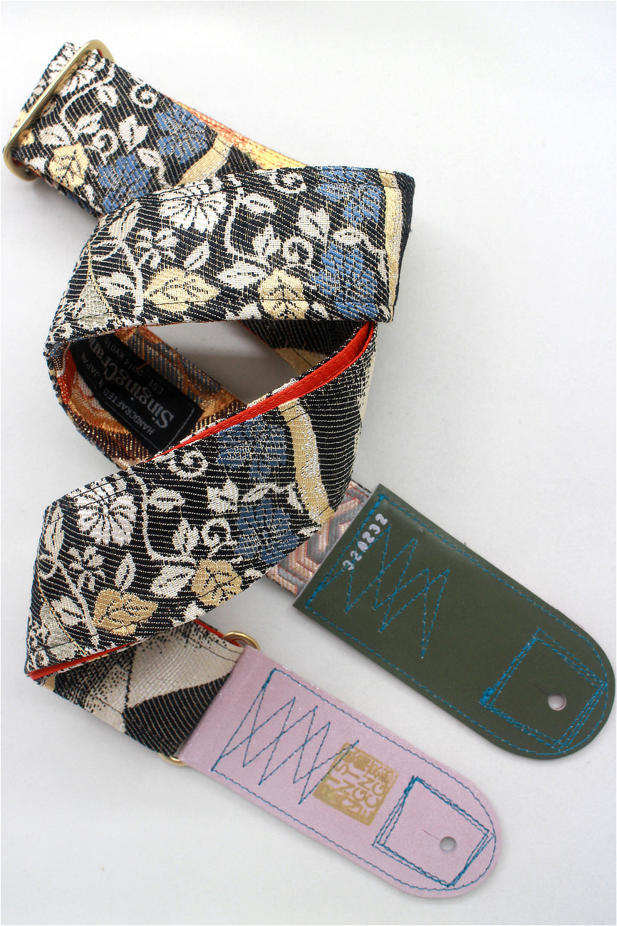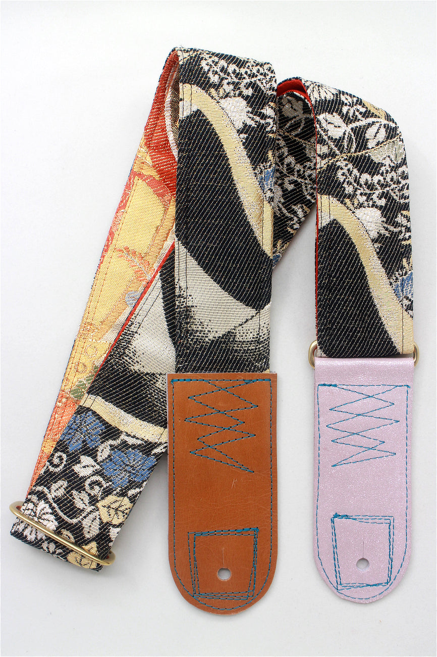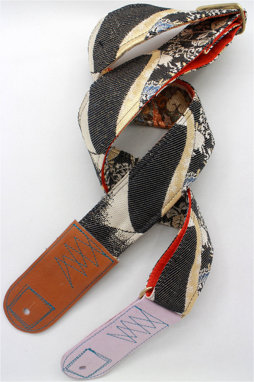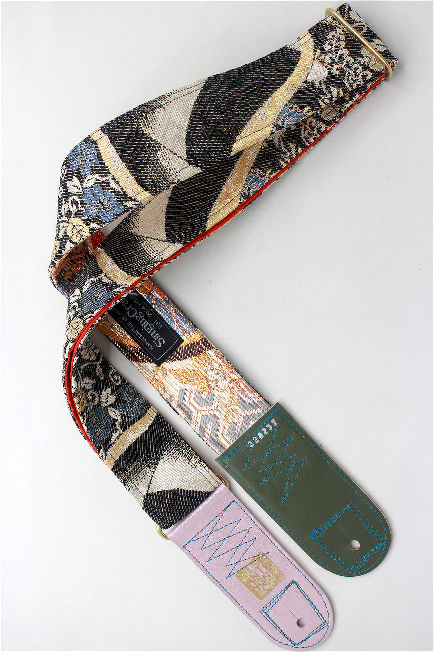 Unique and beautiful guitar strap [SC324232] - hand made in Japan from recycled silk woven kimono obi, leather and brass
