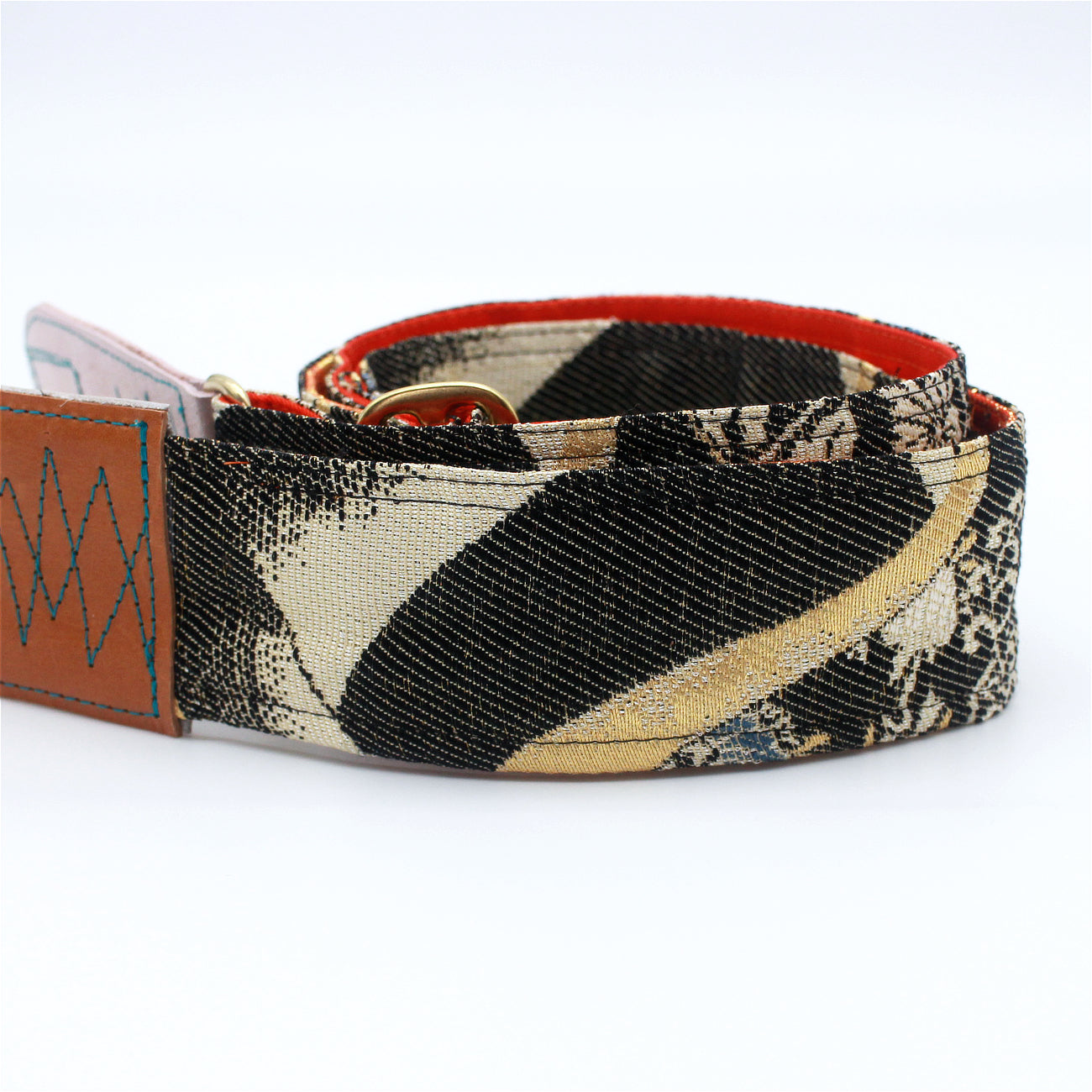 Every Singing Crane strap is one-of-a-kind, one of three variations from the same Obi on the front, and this strap has an orange and gold colour reverse, with hand picked matching leathers and stitching.