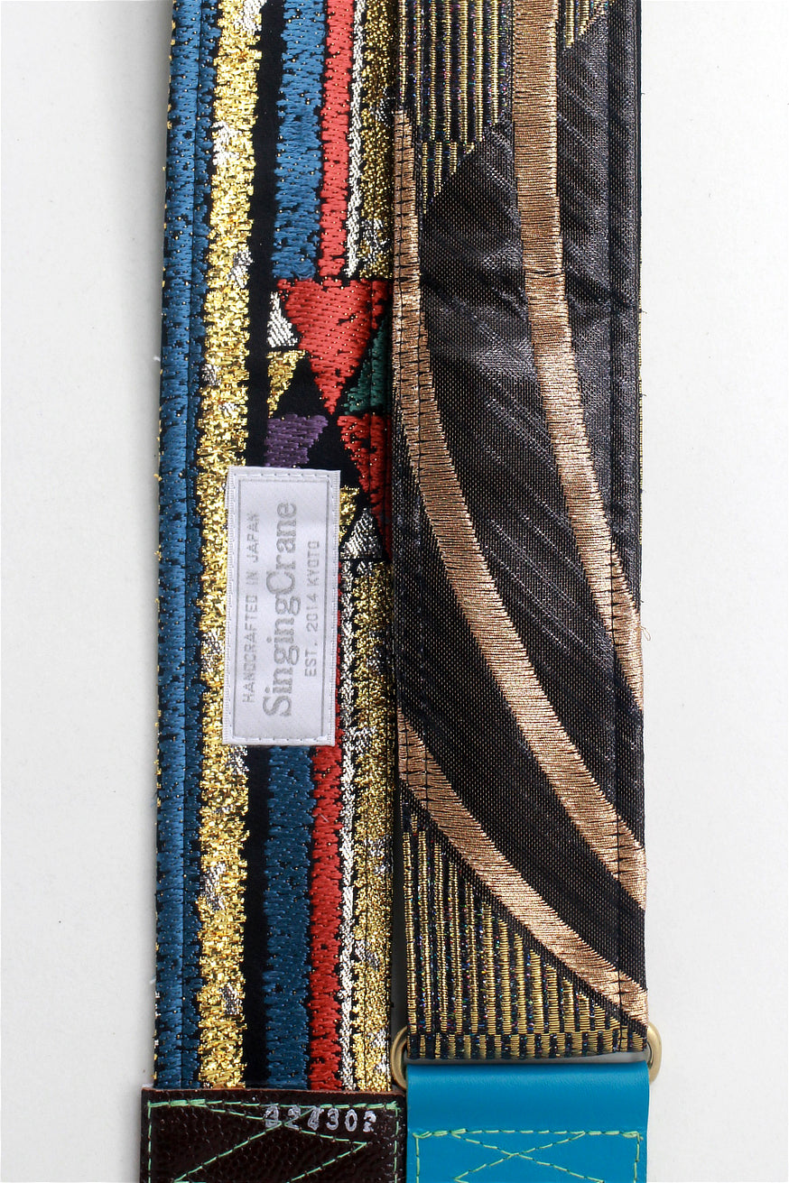 Every Singing Crane strap is one-of-a-kind, one of three variations from the same Obi on the front, and this strap has a blue and gold colour reverse, with hand picked matching leathers and stitching.