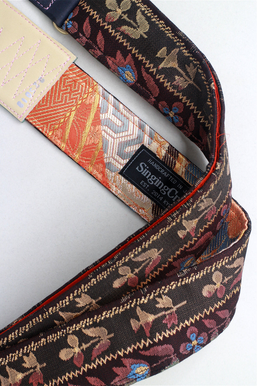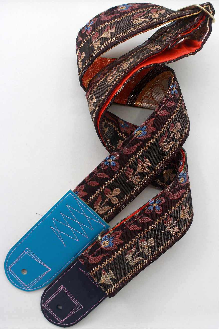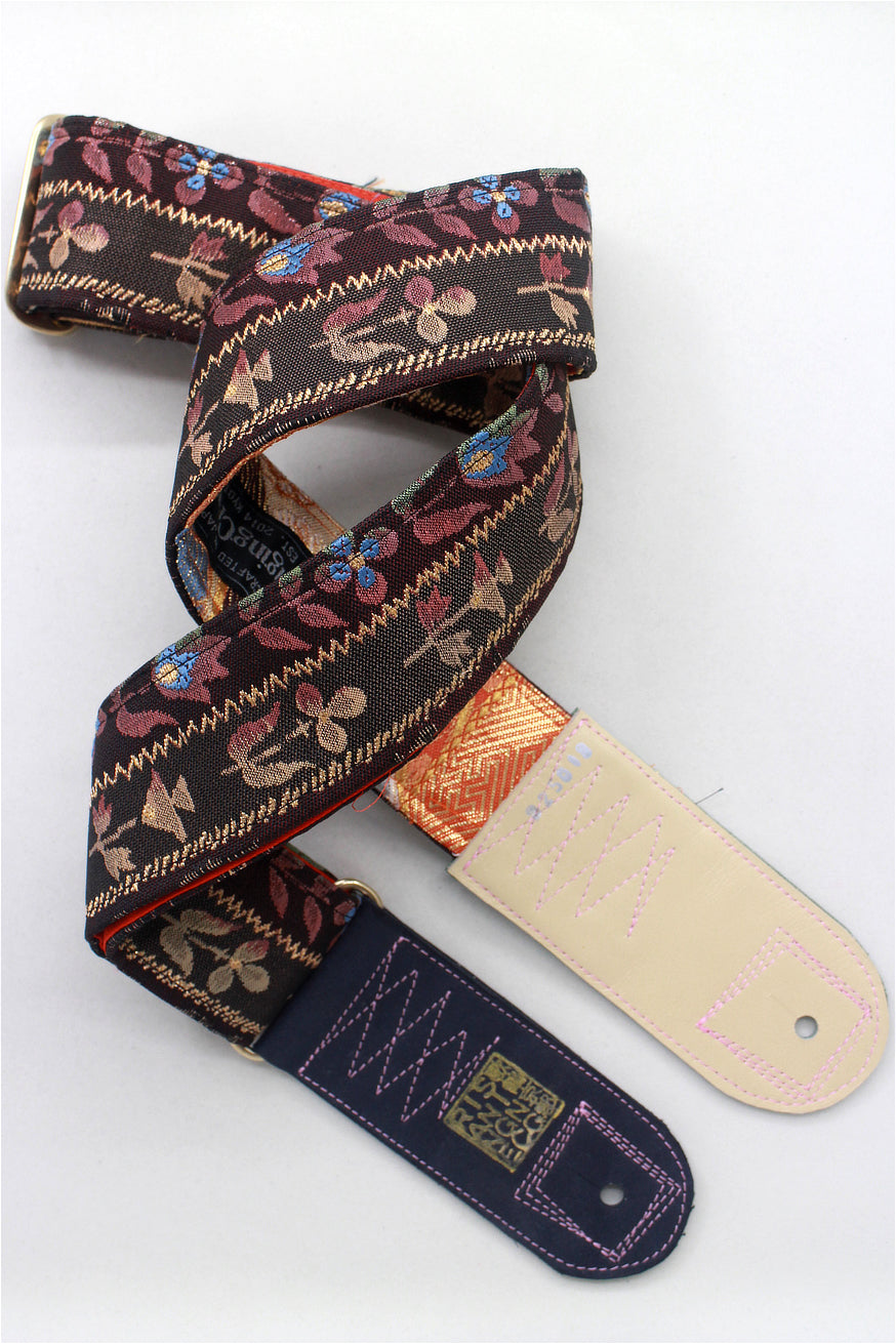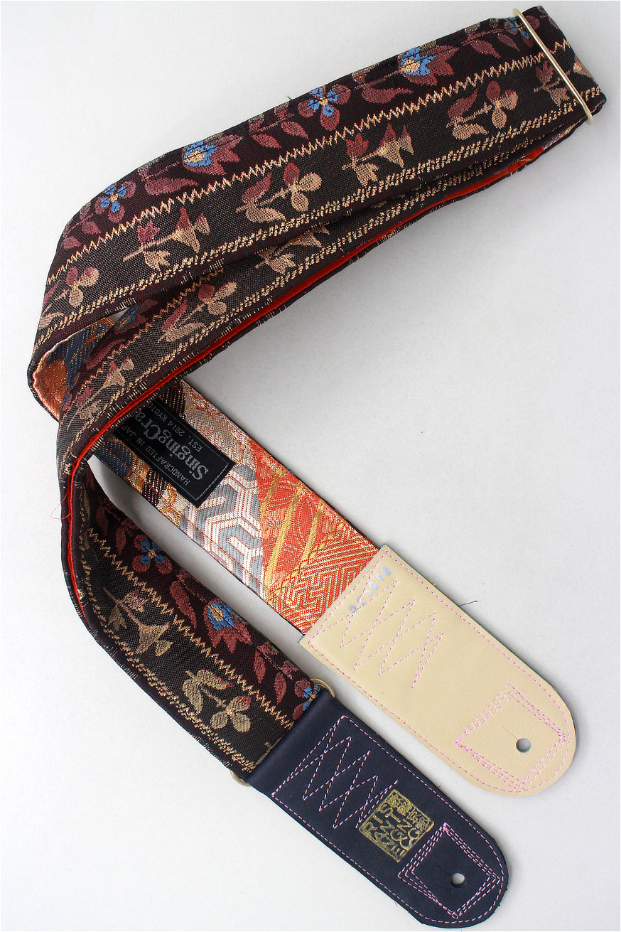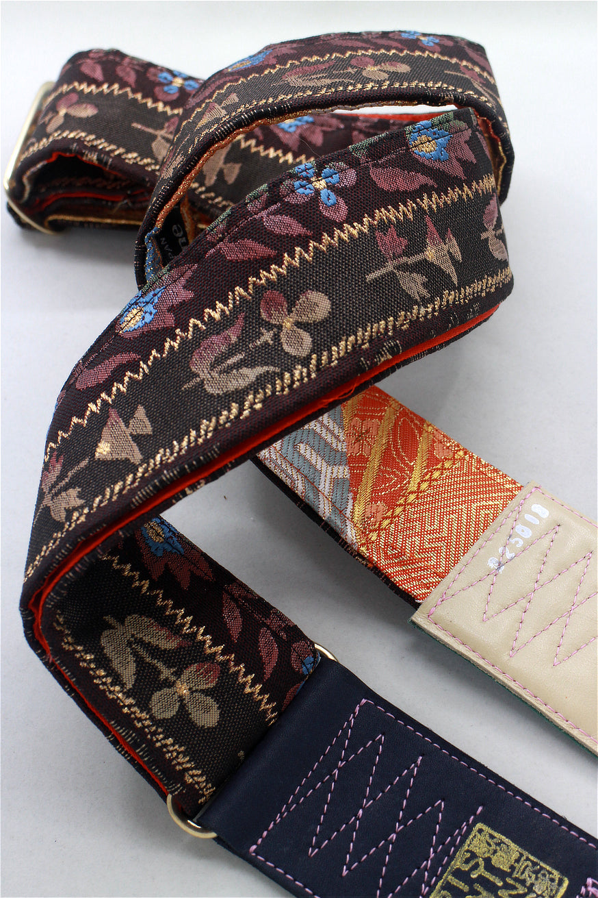 Unique and beautiful guitar strap [SC325012] - hand made in Japan from recycled silk woven kimono obi, leather and brass