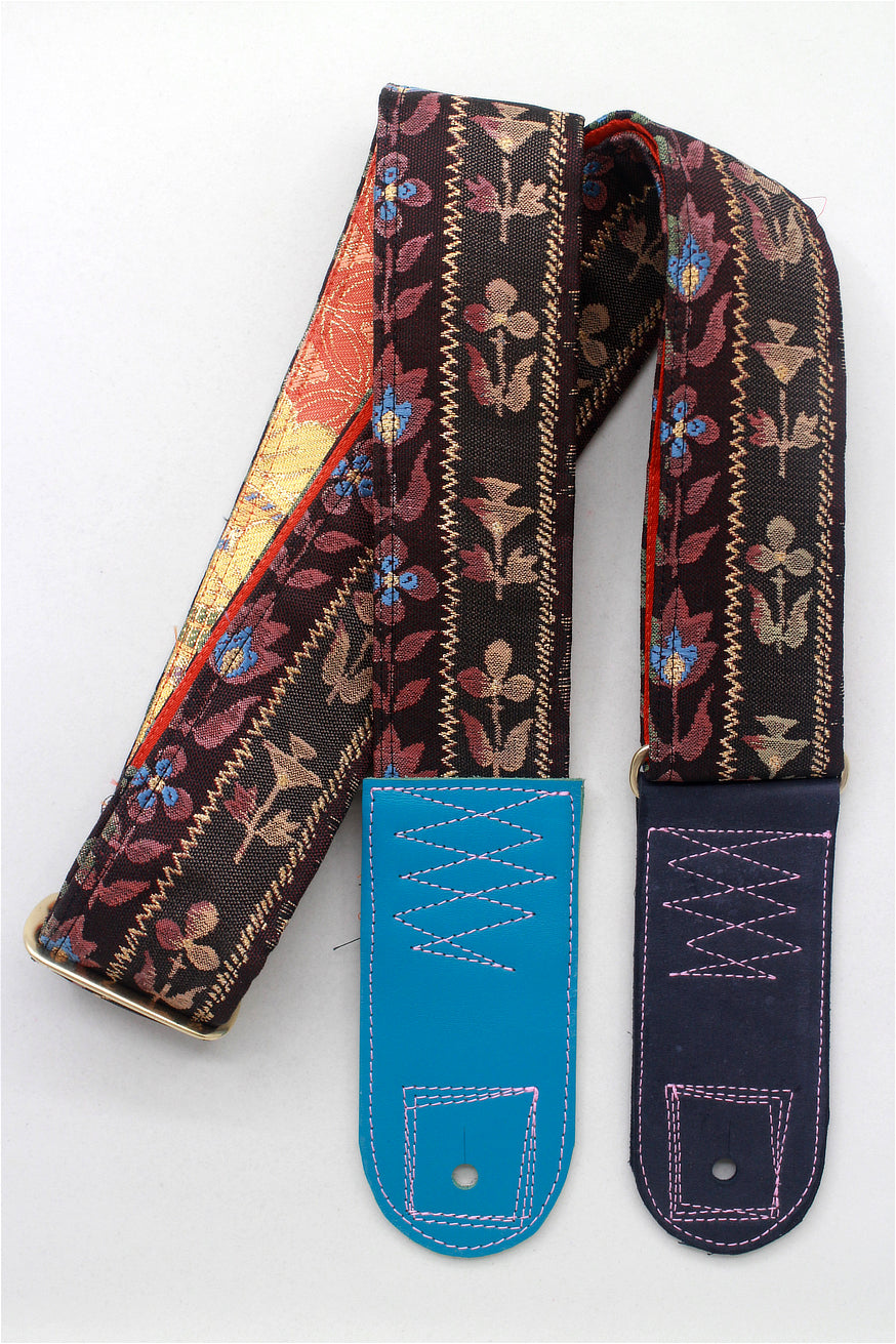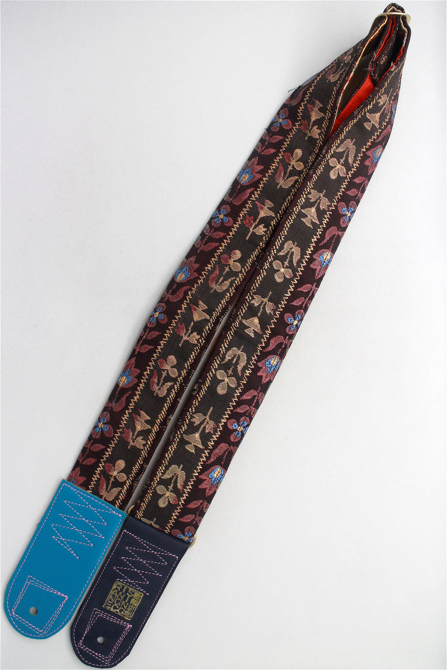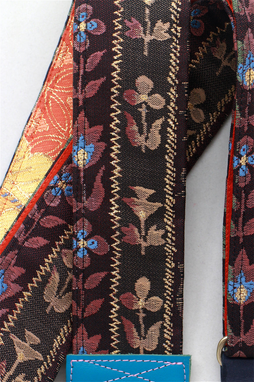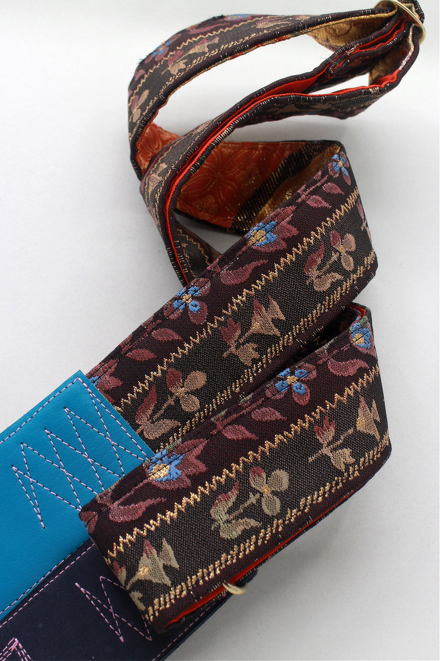Unique and beautiful guitar strap [SC325012] - hand made in Japan from recycled silk woven kimono obi, leather and brass