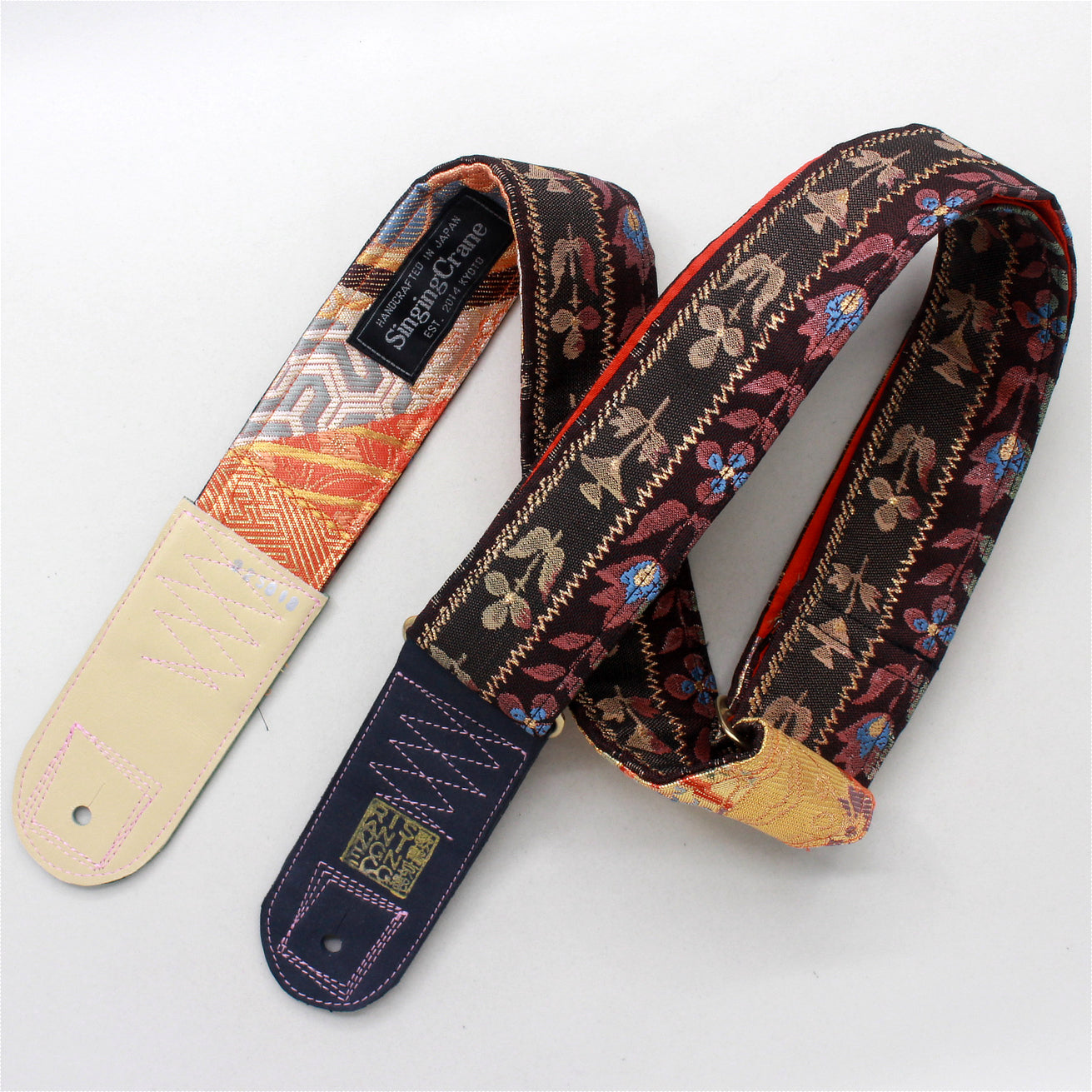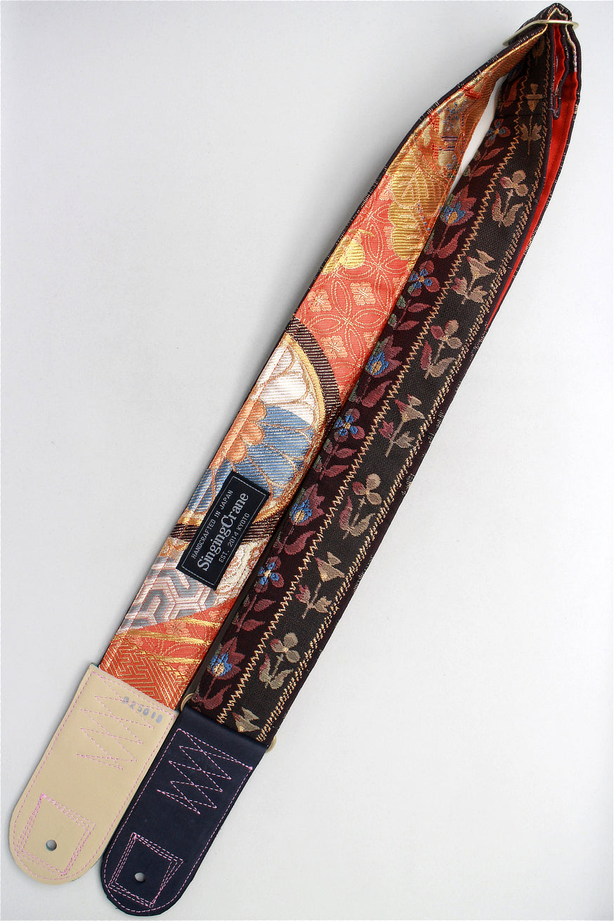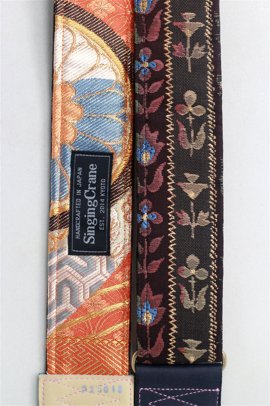 Every Singing Crane strap is one-of-a-kind, one of three variations from the same Obi on the front, and this strap has an orange and gold colour reverse, with hand picked matching leathers and stitching.