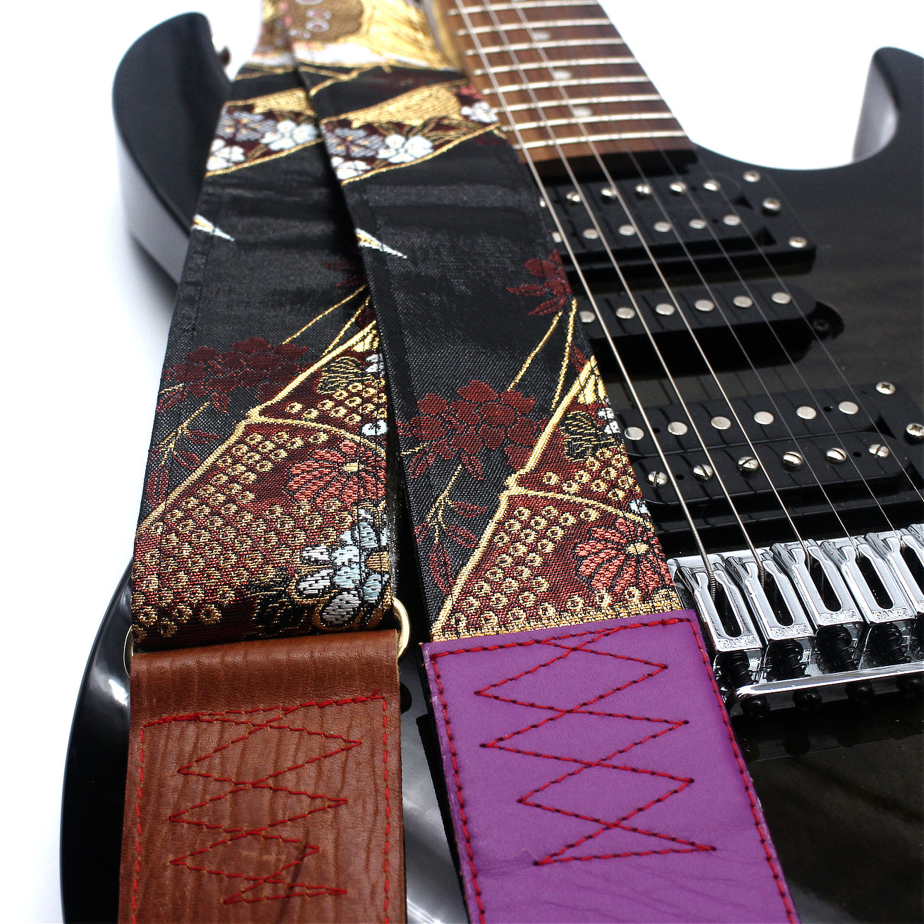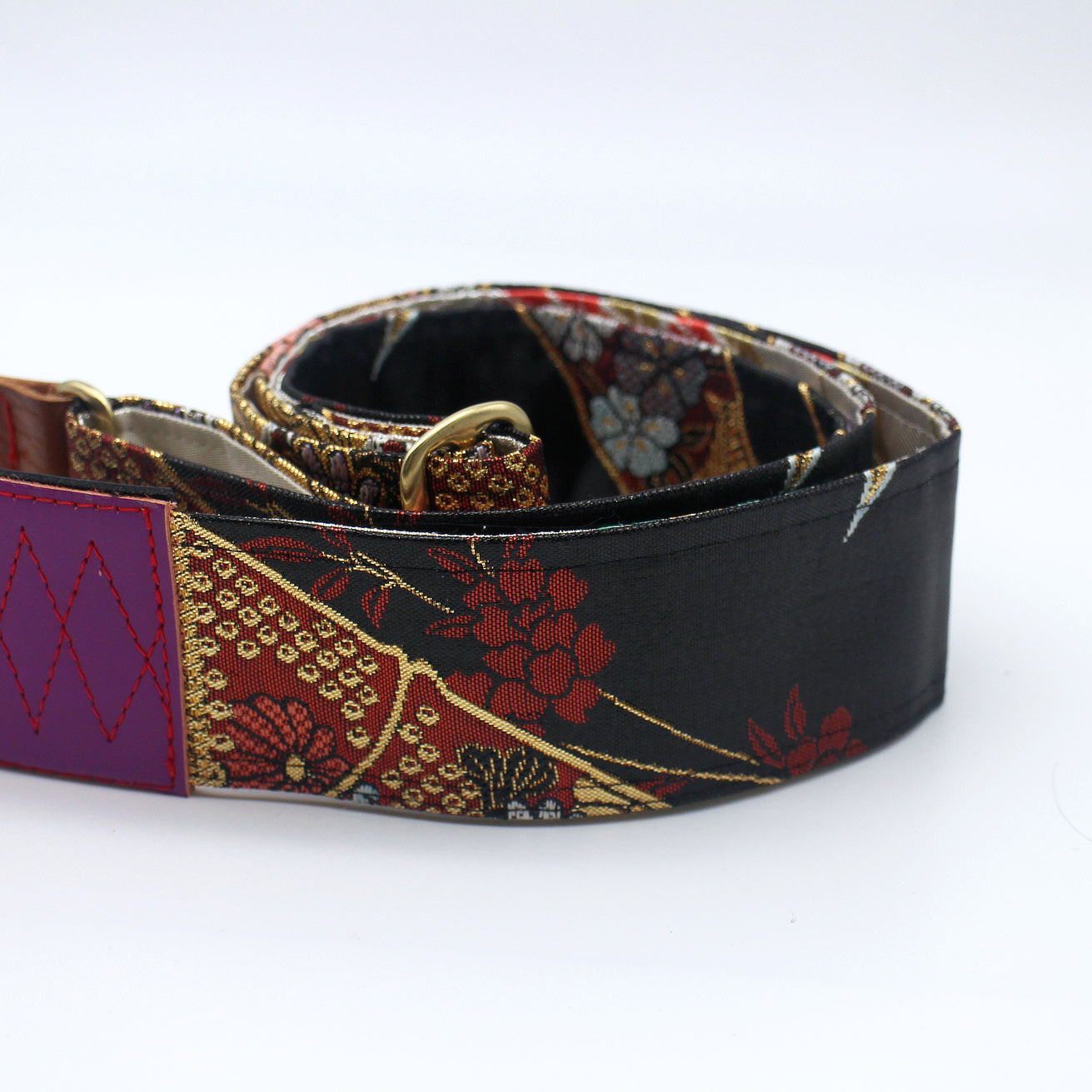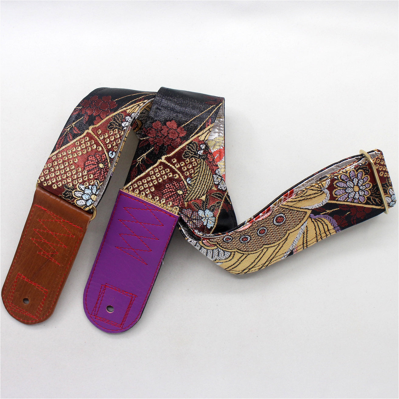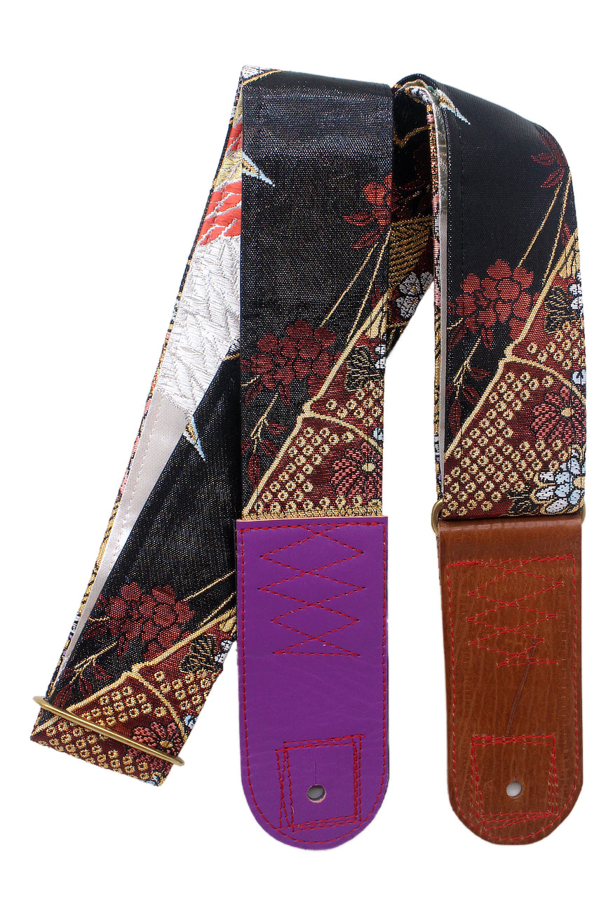 Unique and beautiful guitar strap [SC325071] - hand made in Japan from recycled silk woven kimono obi, leather and brass