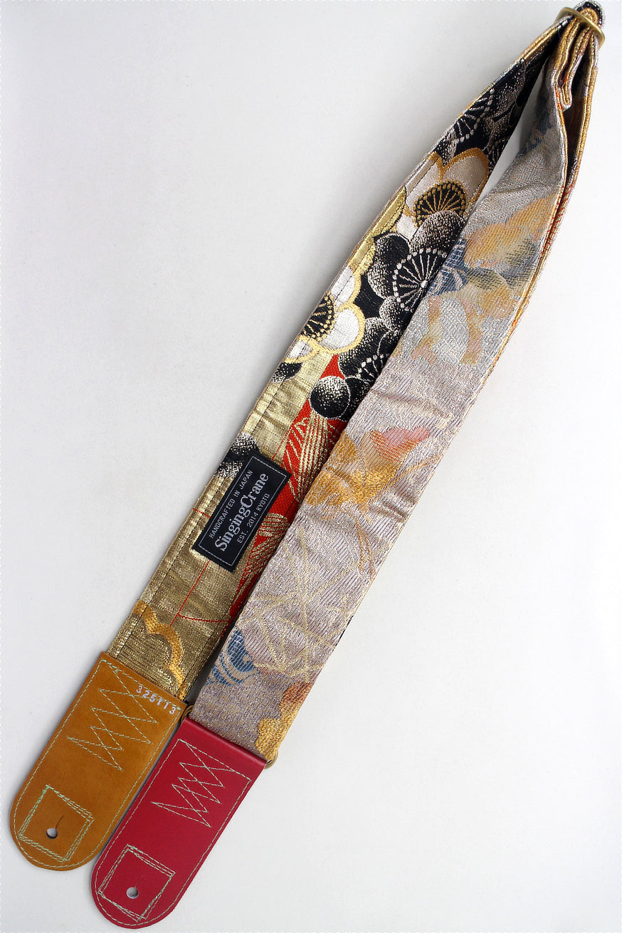 Every Singing Crane strap is one-of-a-kind, one of three variations from the same Obi on the front, and this strap has a gold colour reverse, with hand picked matching leathers and stitching.