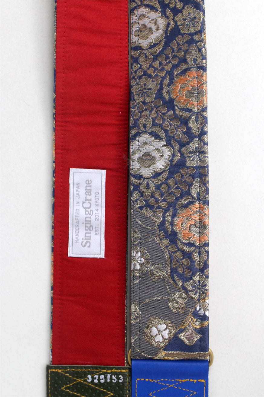 Every Singing Crane strap is one-of-a-kind, one of three variations from the same Obi on the front, and this strap has a red colour reverse, with hand picked matching leathers and stitching.