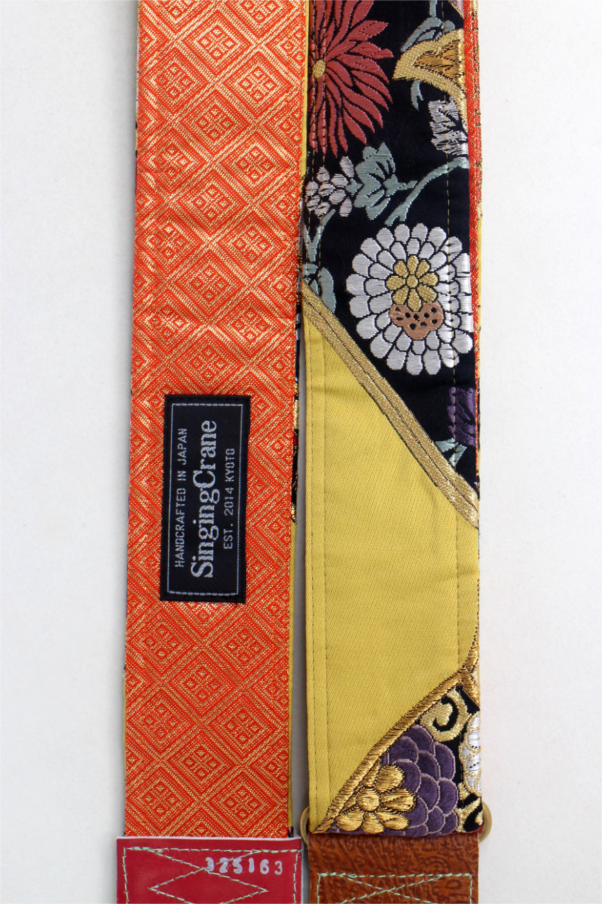 Every Singing Crane strap is one-of-a-kind, one of three variations from the same Obi on the front, and this strap has a gold and orange colour reverse, with hand picked matching leathers and stitching.