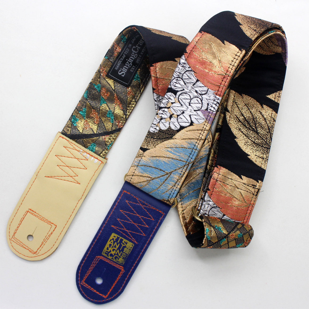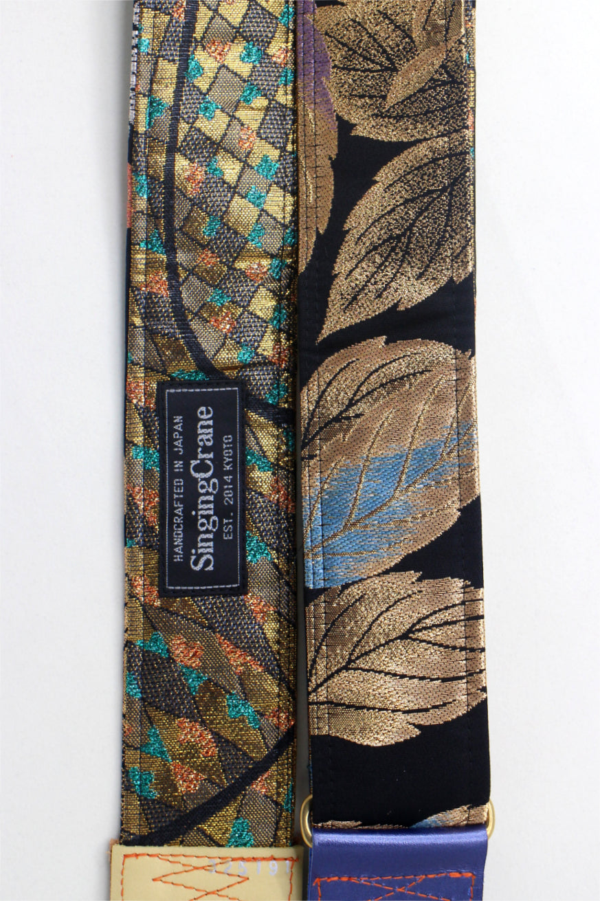 Every Singing Crane strap is one-of-a-kind, one of three variations from the same Obi on the front, and this strap has a gold colour reverse, with hand picked matching leathers and stitching.