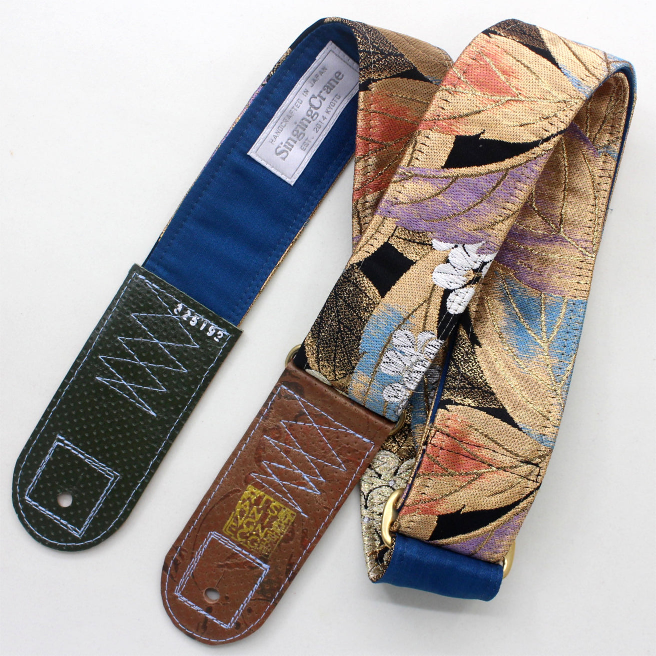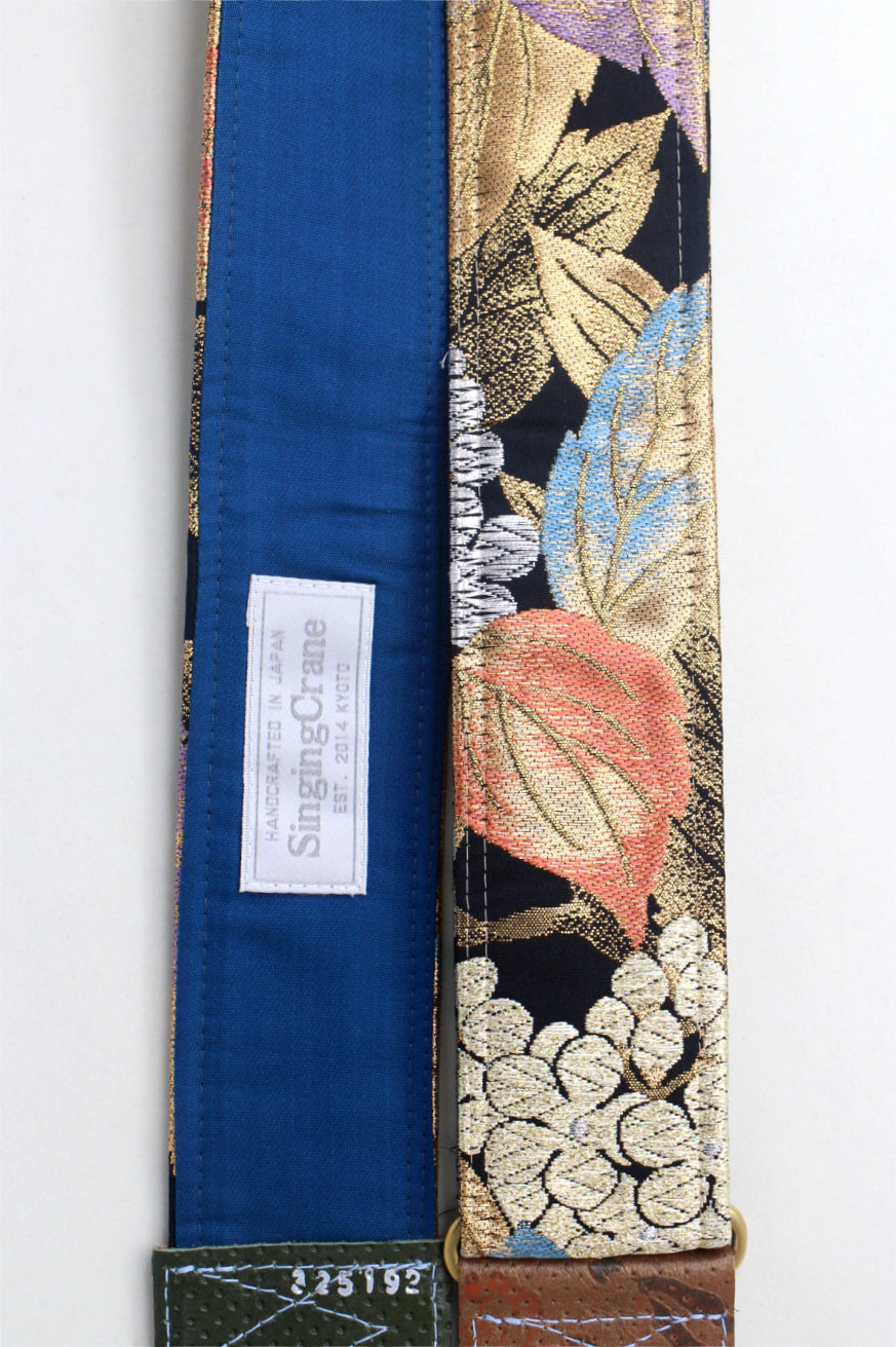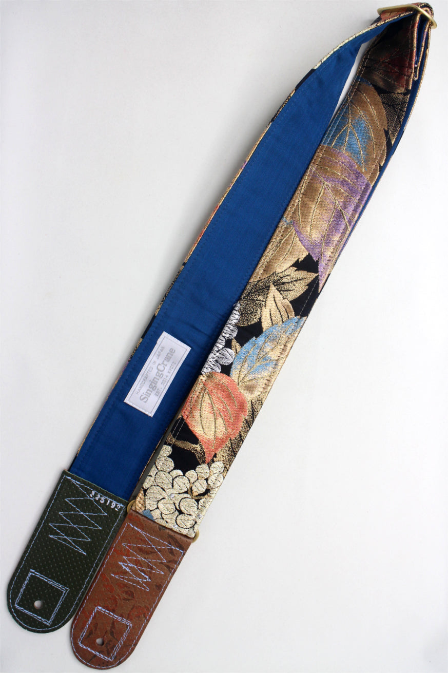 Every Singing Crane strap is one-of-a-kind, one of three variations from the same Obi on the front, and this strap has a blue colour reverse, with hand picked matching leathers and stitching.