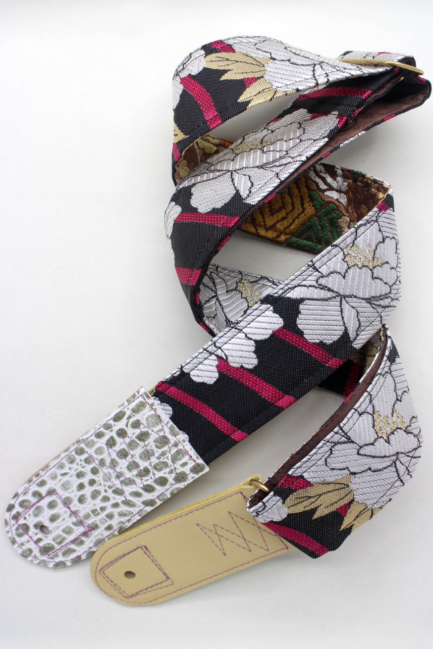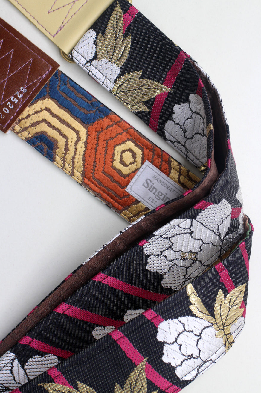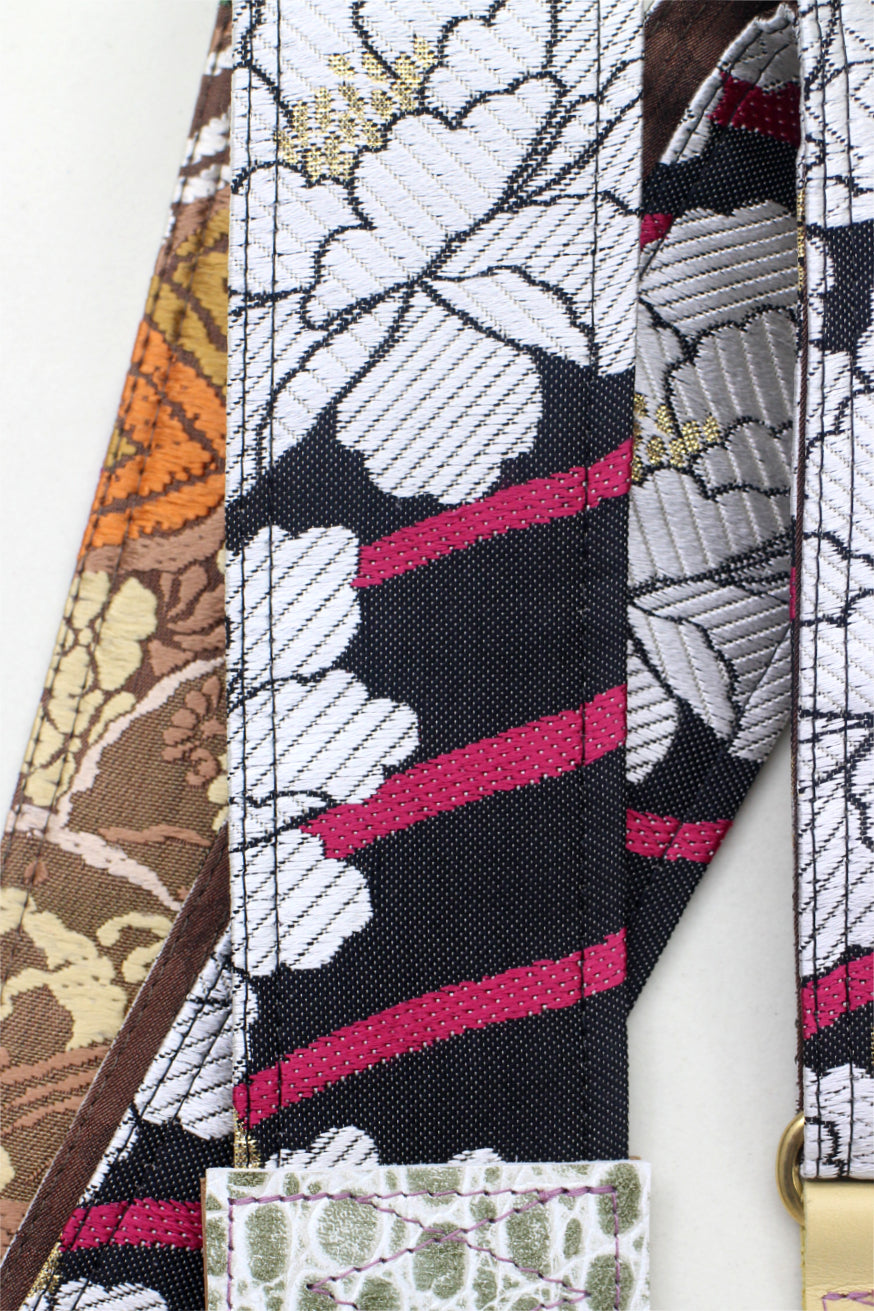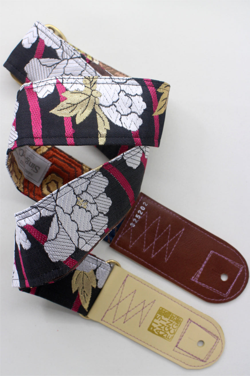 Unique and beautiful guitar strap [SC325202] - hand made in Japan from recycled silk woven kimono obi, leather and brass
