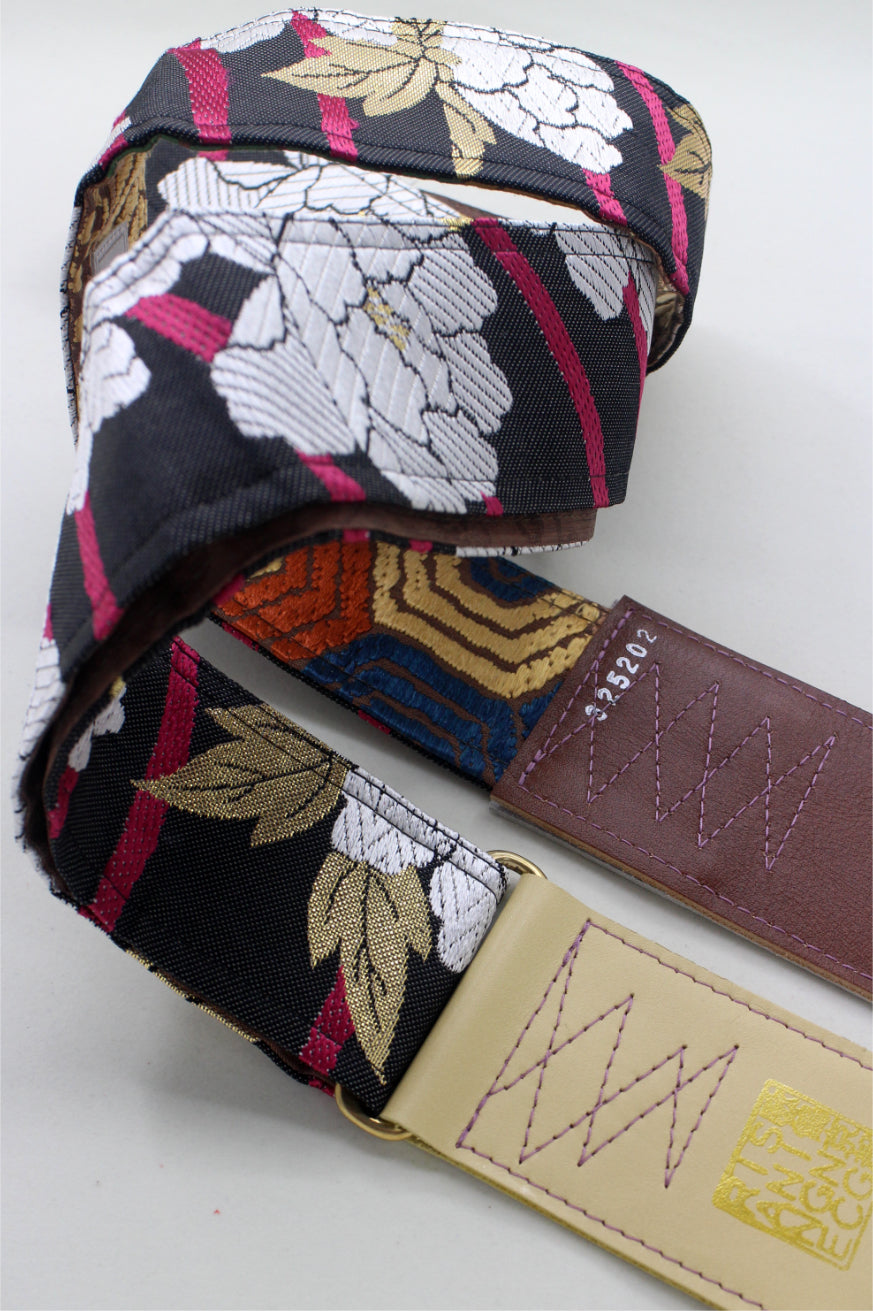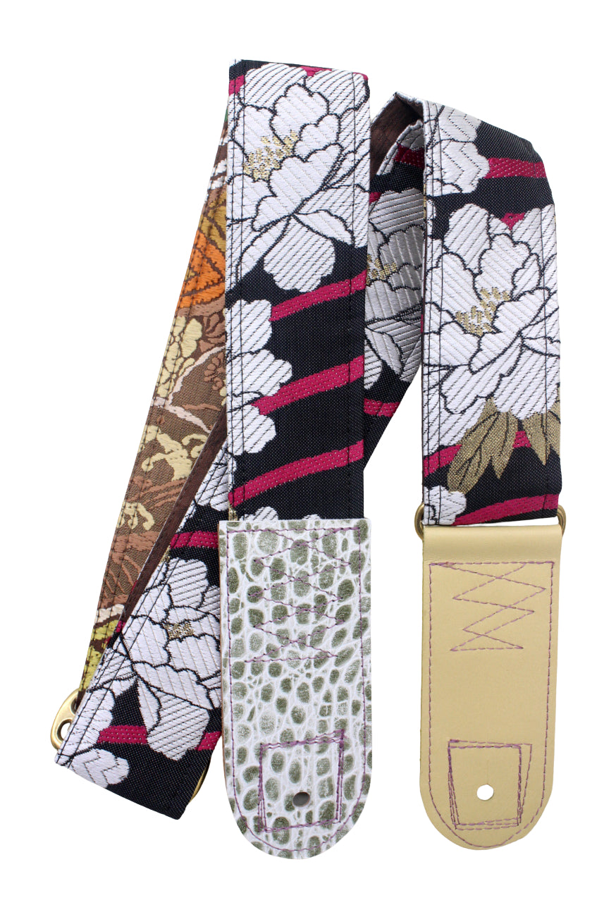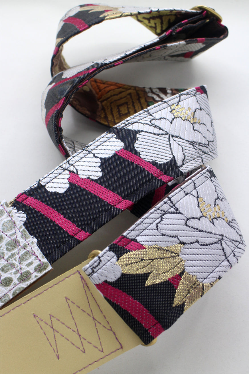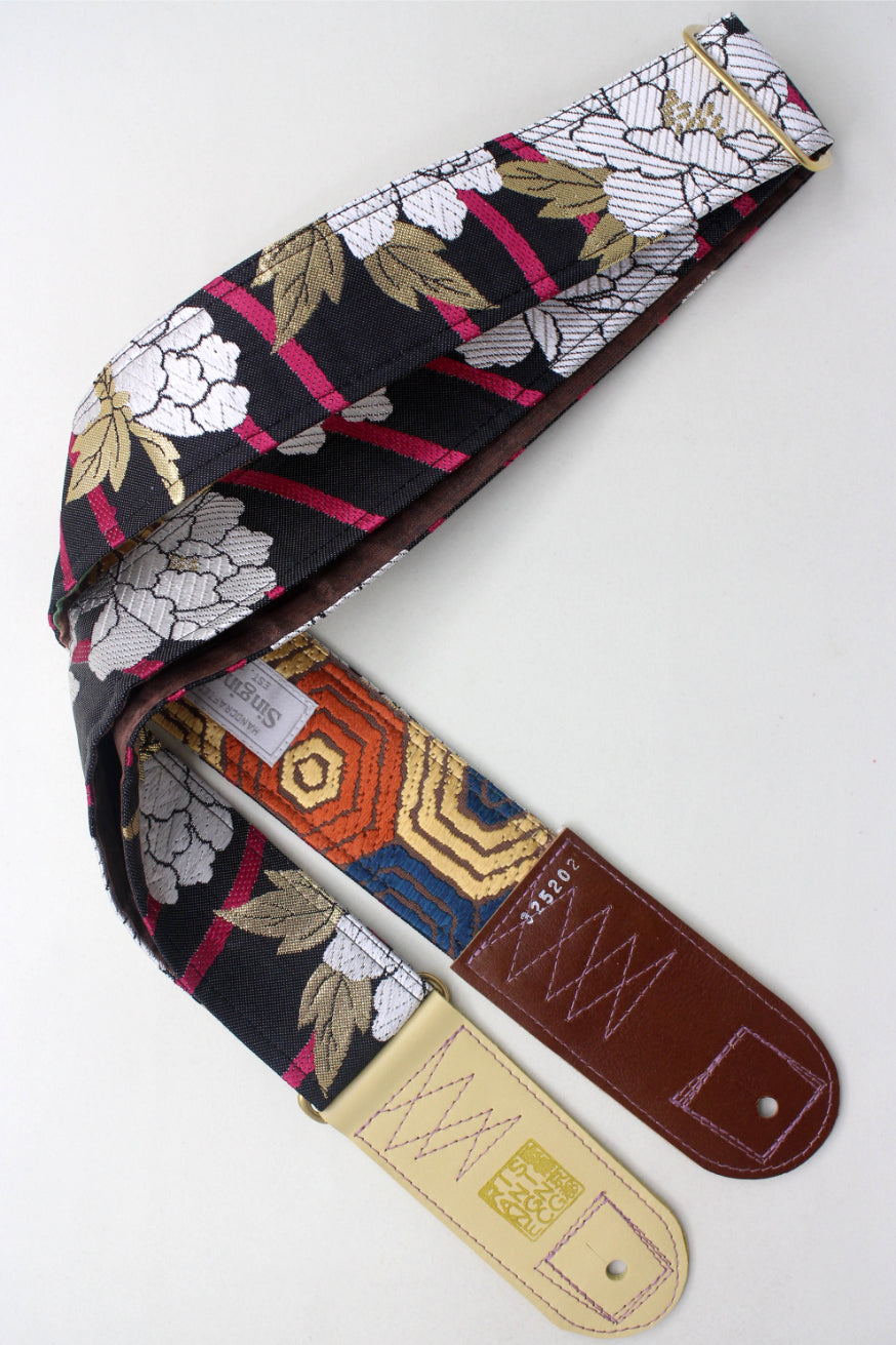 Unique and beautiful guitar strap [SC325202] - hand made in Japan from recycled silk woven kimono obi, leather and brass