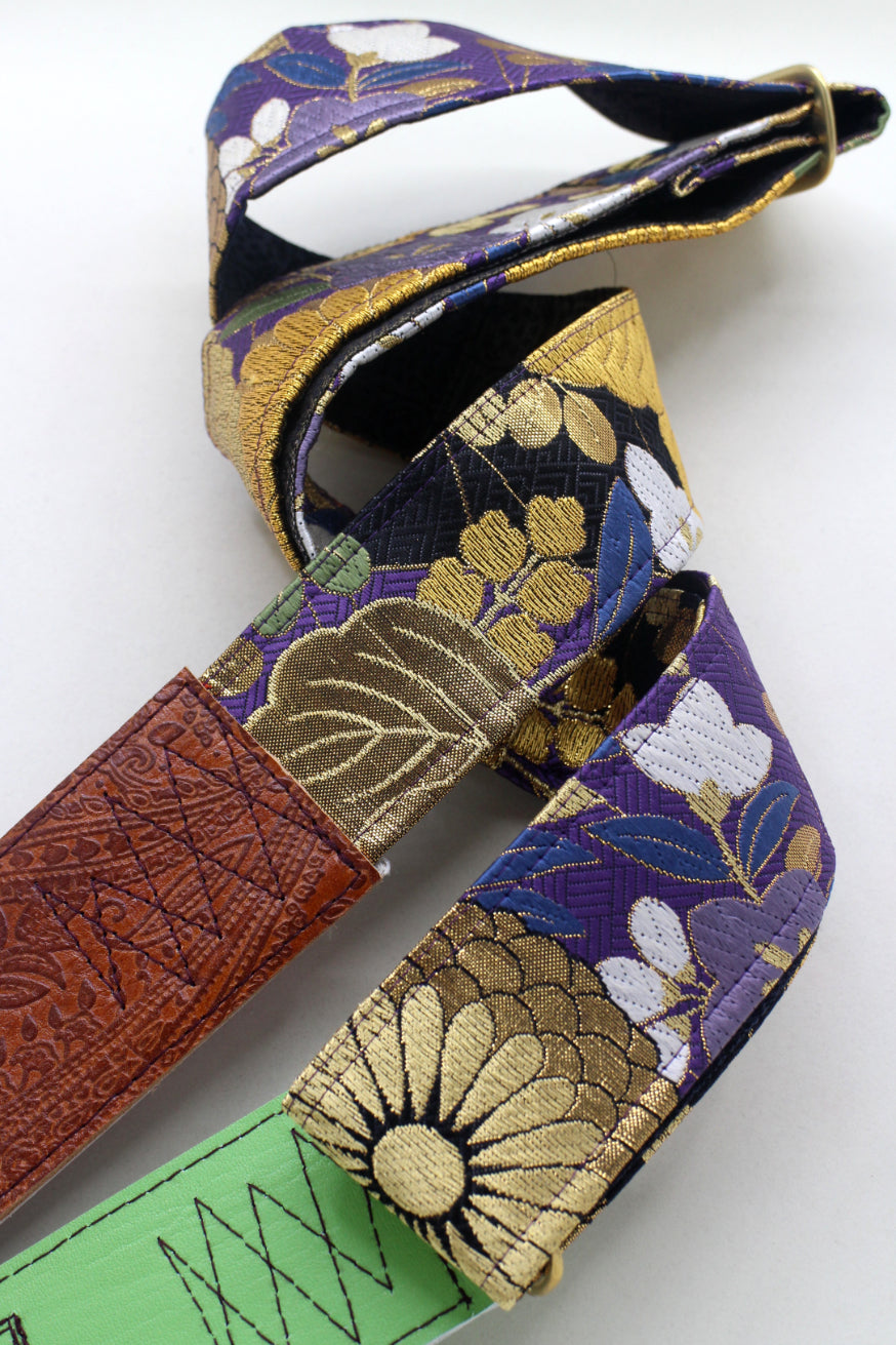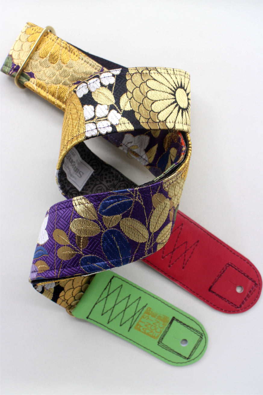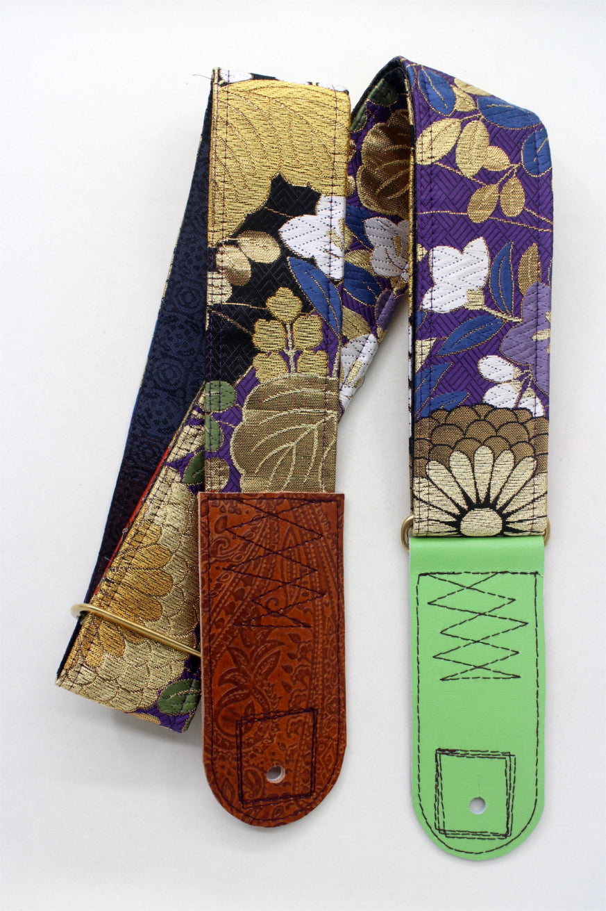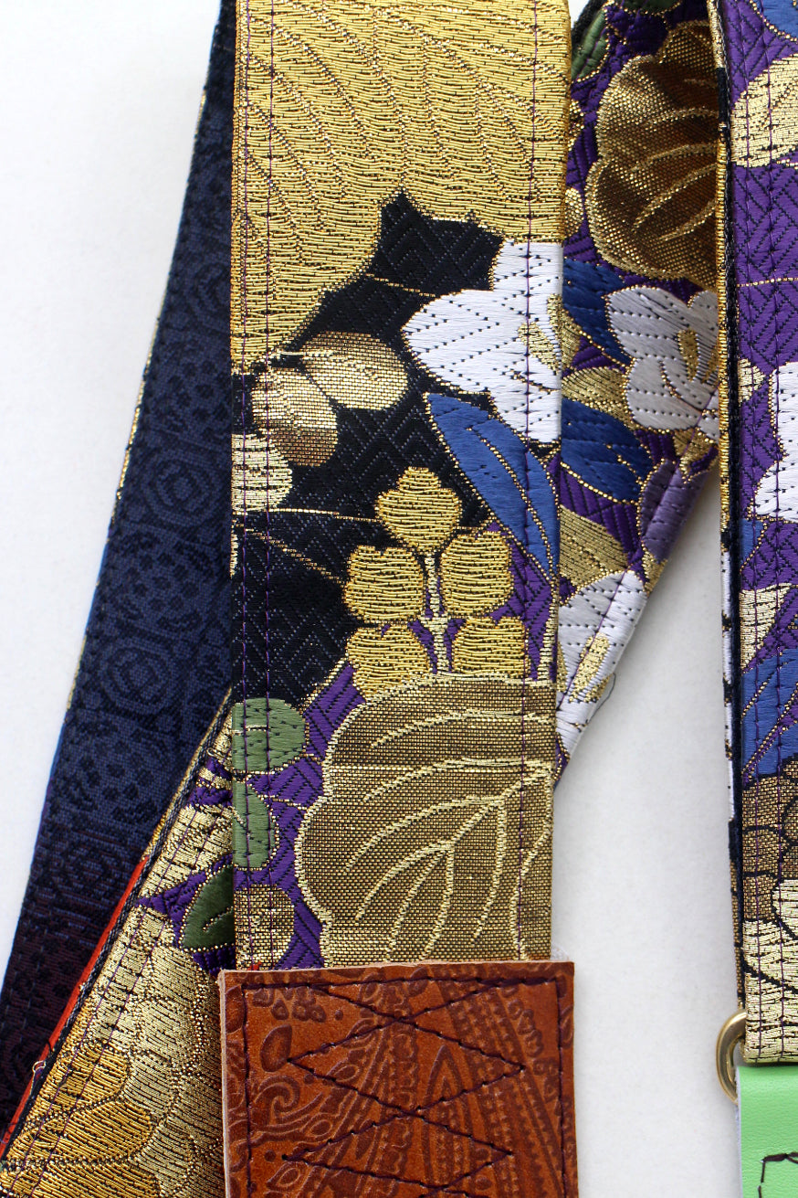 Unique and beautiful guitar strap [SC325212] - hand made in Japan from recycled silk woven kimono obi, leather and brass
