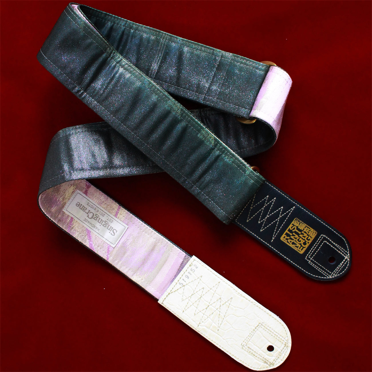 Every Singing Crane strap is one-of-a-kind, one of three variations from the same Obi on the front, and this strap has a light mauve reverse, with hand picked matching leathers and stitching.