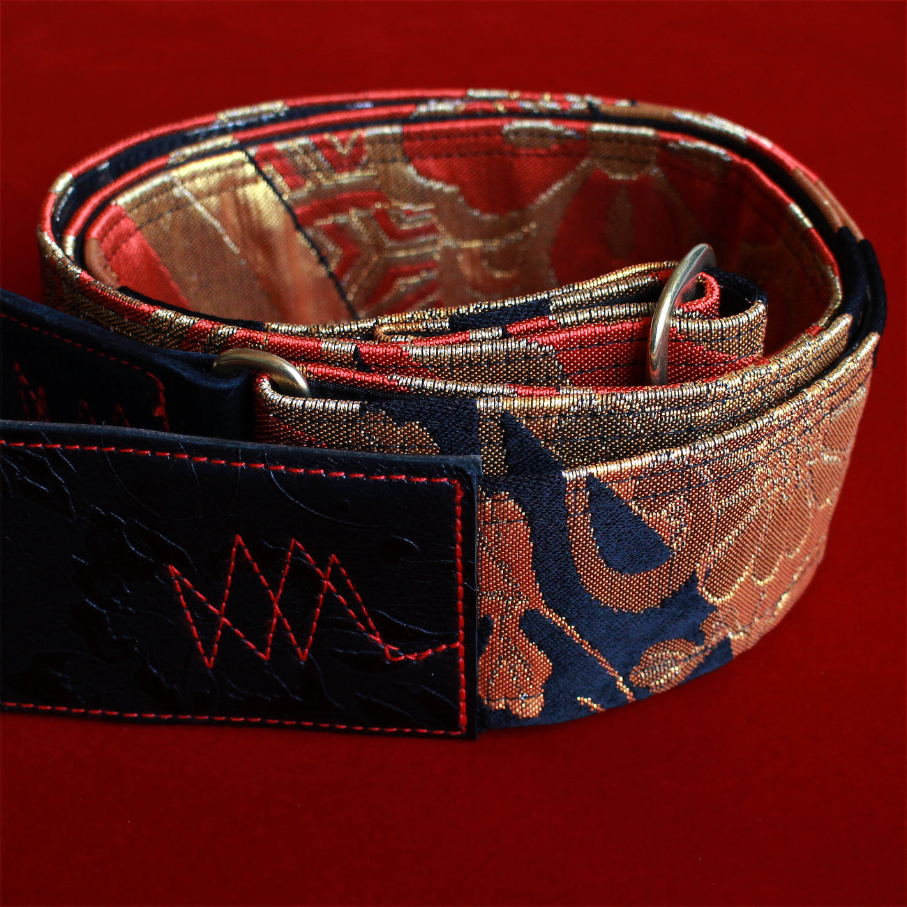 Every Singing Crane strap is one-of-a-kind, one of three variations from the same Obi on the front, and this strap has a black/silver colour reverse, with hand picked matching leathers and stitching.