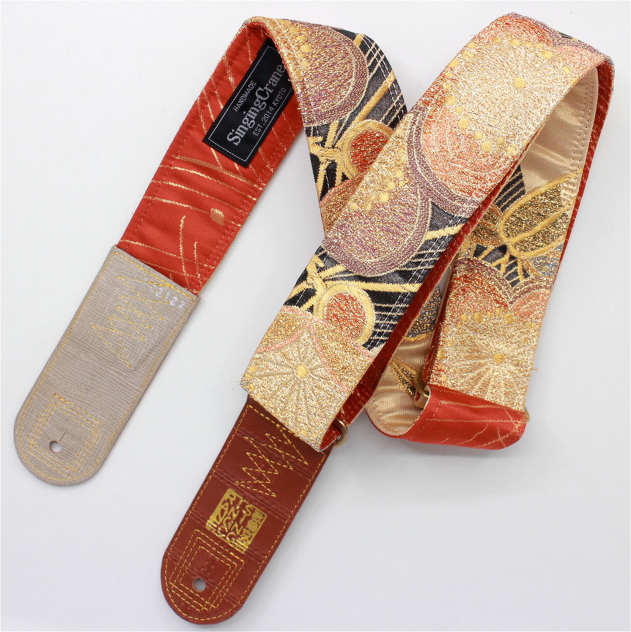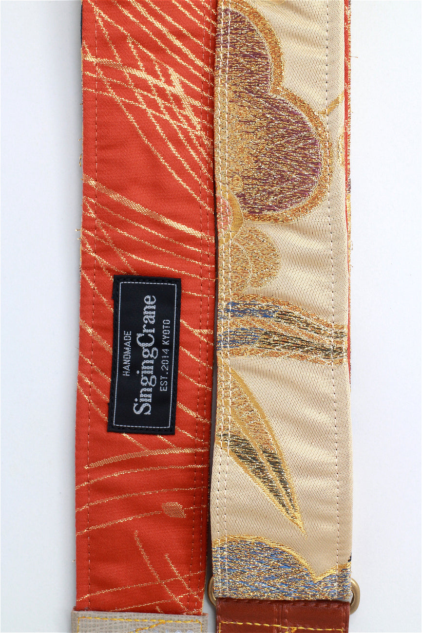 Every Singing Crane strap is one-of-a-kind, one of three variations from the same Obi on the front, and this strap has a red-orange colour reverse, with hand picked matching leathers and stitching.
