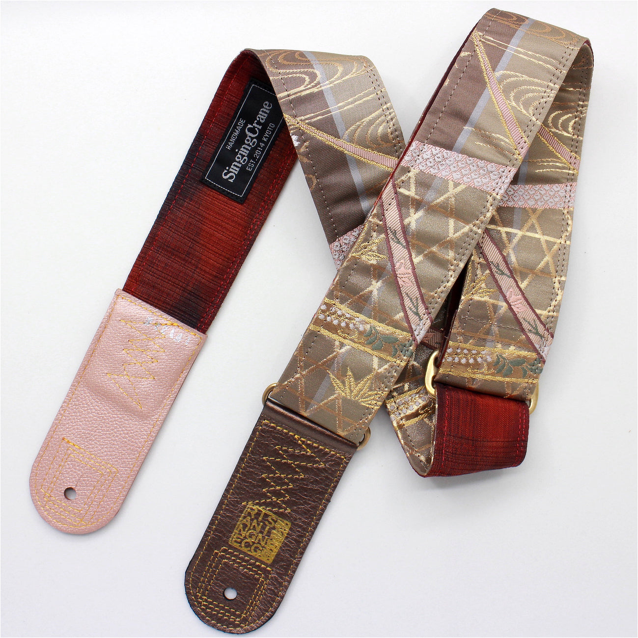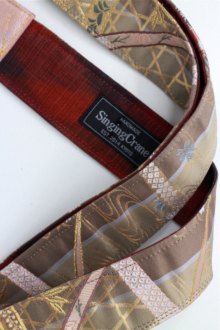 Every Singing Crane strap is one-of-a-kind, one of three variations from the same Obi on the front, and this strap has a red colour reverse, with hand picked matching leathers and stitching.