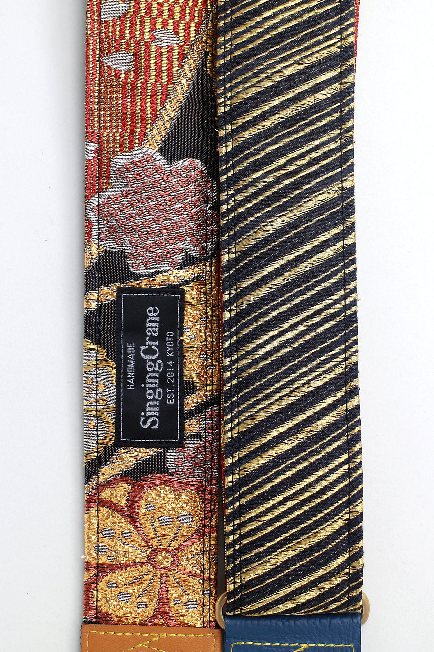 Every Singing Crane strap is one-of-a-kind, one of three variations from the same Obi on the front, and this strap has a gold/red colour reverse, with hand picked matching leathers and stitching.