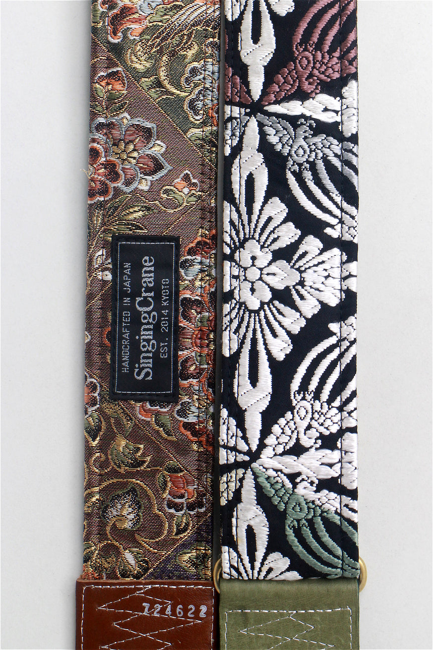 Every Singing Crane strap is one-of-a-kind, one of three variations from the same Obi on the front, and this strap has a brown colour reverse, with hand picked matching leathers and stitching.
