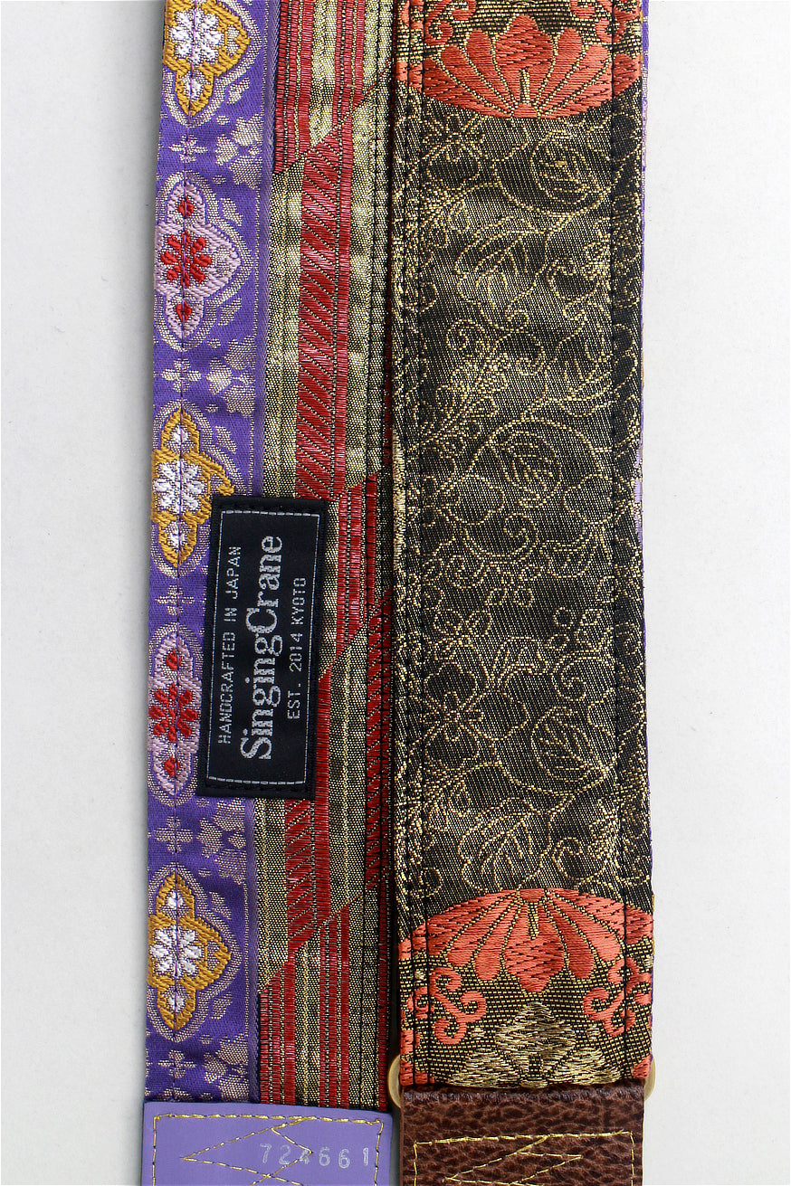 Every Singing Crane strap is one-of-a-kind, one of three variations from the same Obi on the front, and this strap has a purple colour reverse, with hand picked matching leathers and stitching.