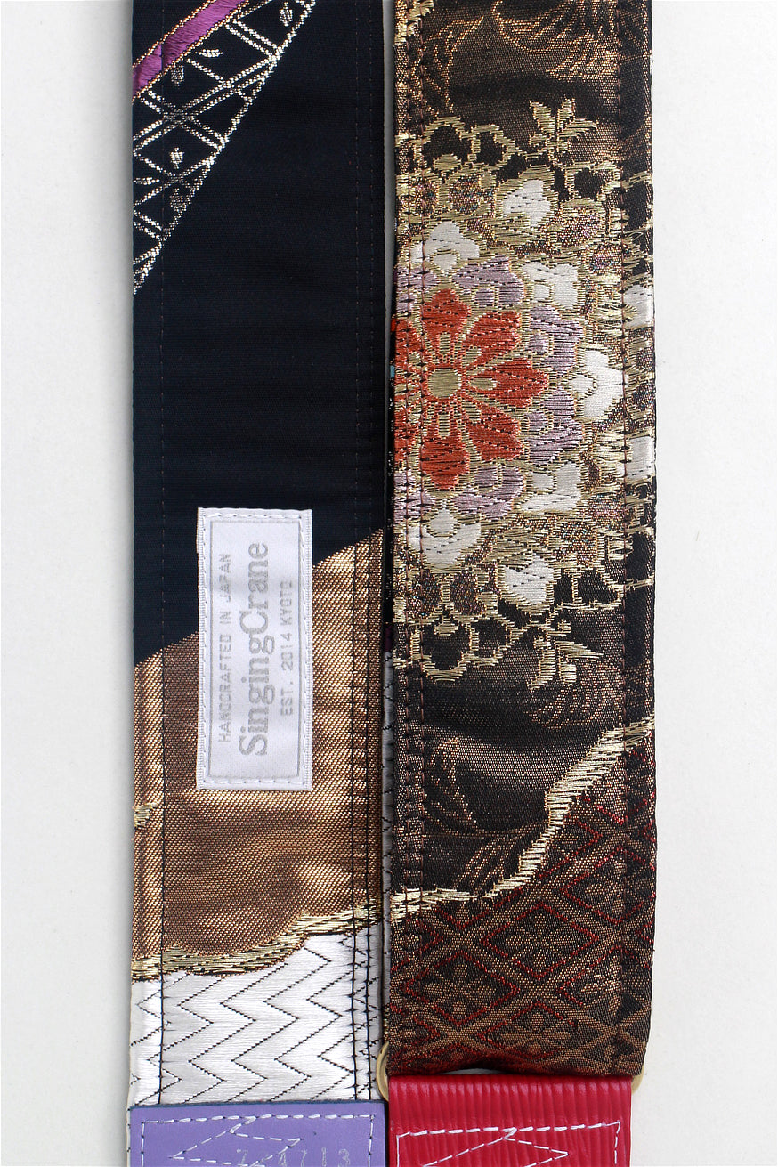 Every Singing Crane strap is one-of-a-kind, one of three variations from the same Obi on the front, and this strap has a black colour reverse, with hand picked matching leathers and stitching.