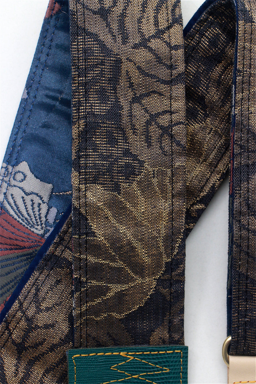 Every Singing Crane strap is one-of-a-kind, one of three variations from the same Obi on the front, and this strap has a sea blue colour reverse, with hand picked matching leathers and stitching.