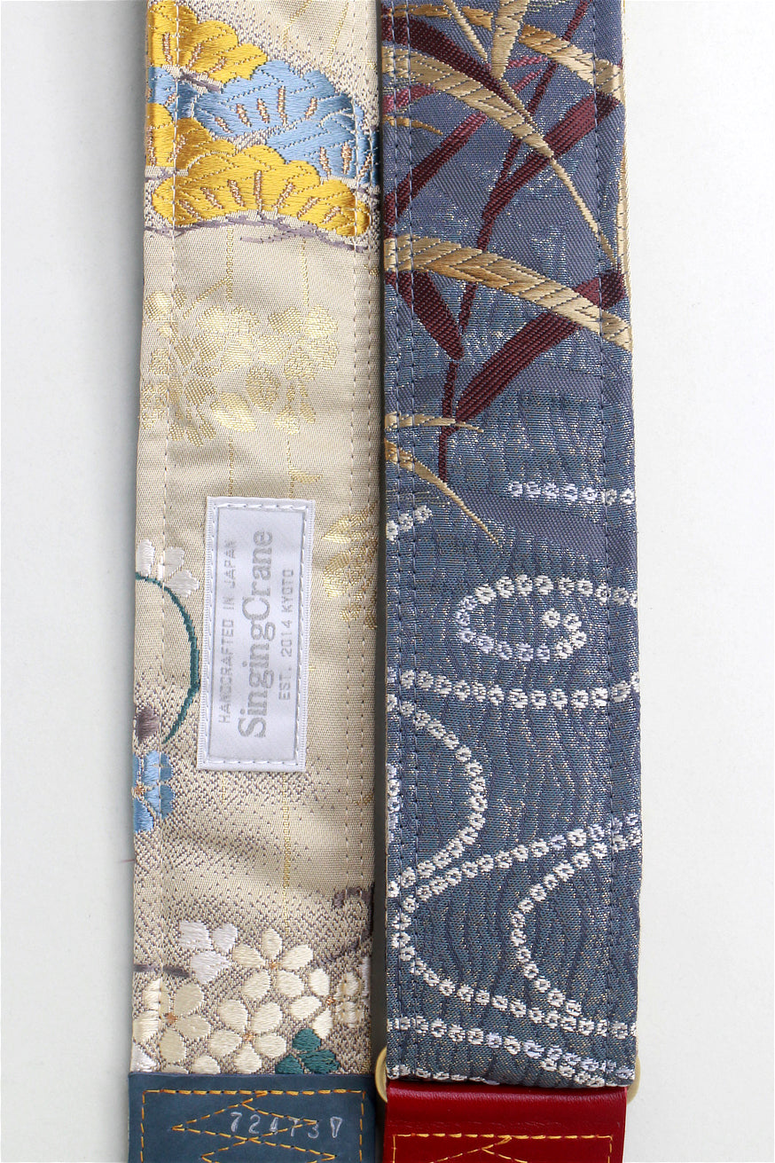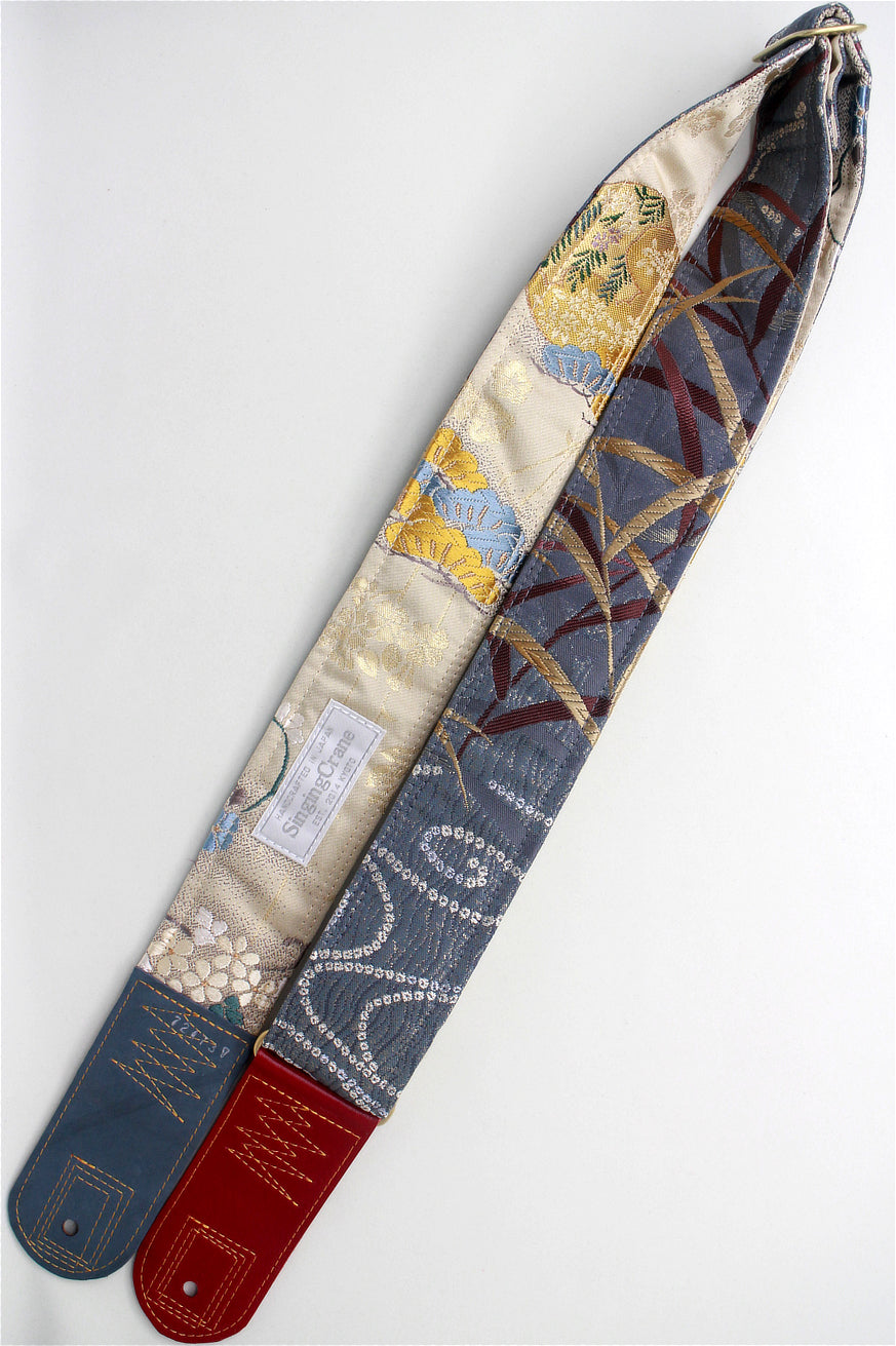 Every Singing Crane strap is one-of-a-kind, one of three variations from the same Obi on the front, and this strap has a champagne colour reverse, with hand picked matching leathers and stitching.