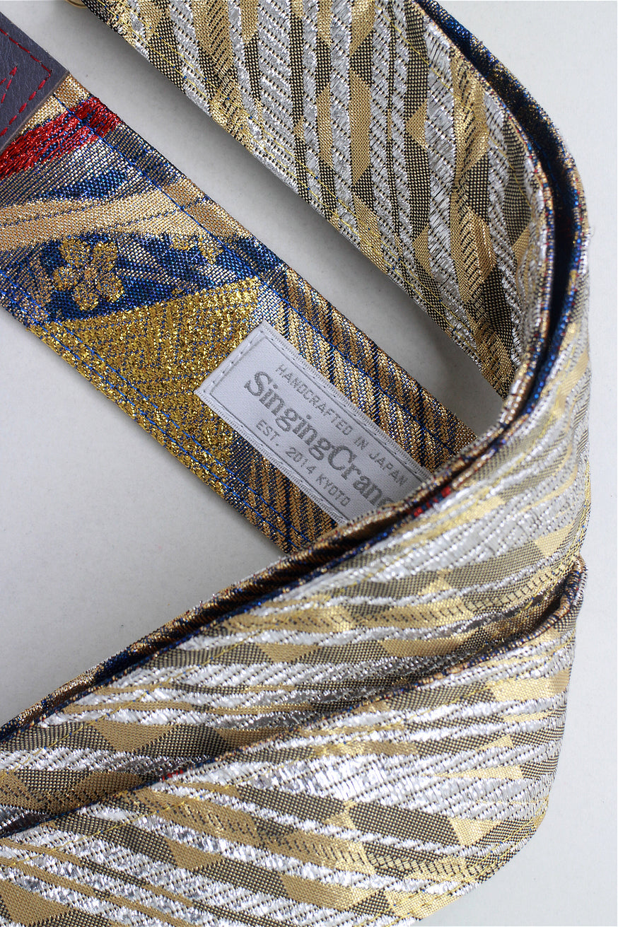 Every Singing Crane strap is one-of-a-kind, one of three variations from the same Obi on the front, and this strap has a blue and gold colour reverse, with hand picked matching leathers and stitching.