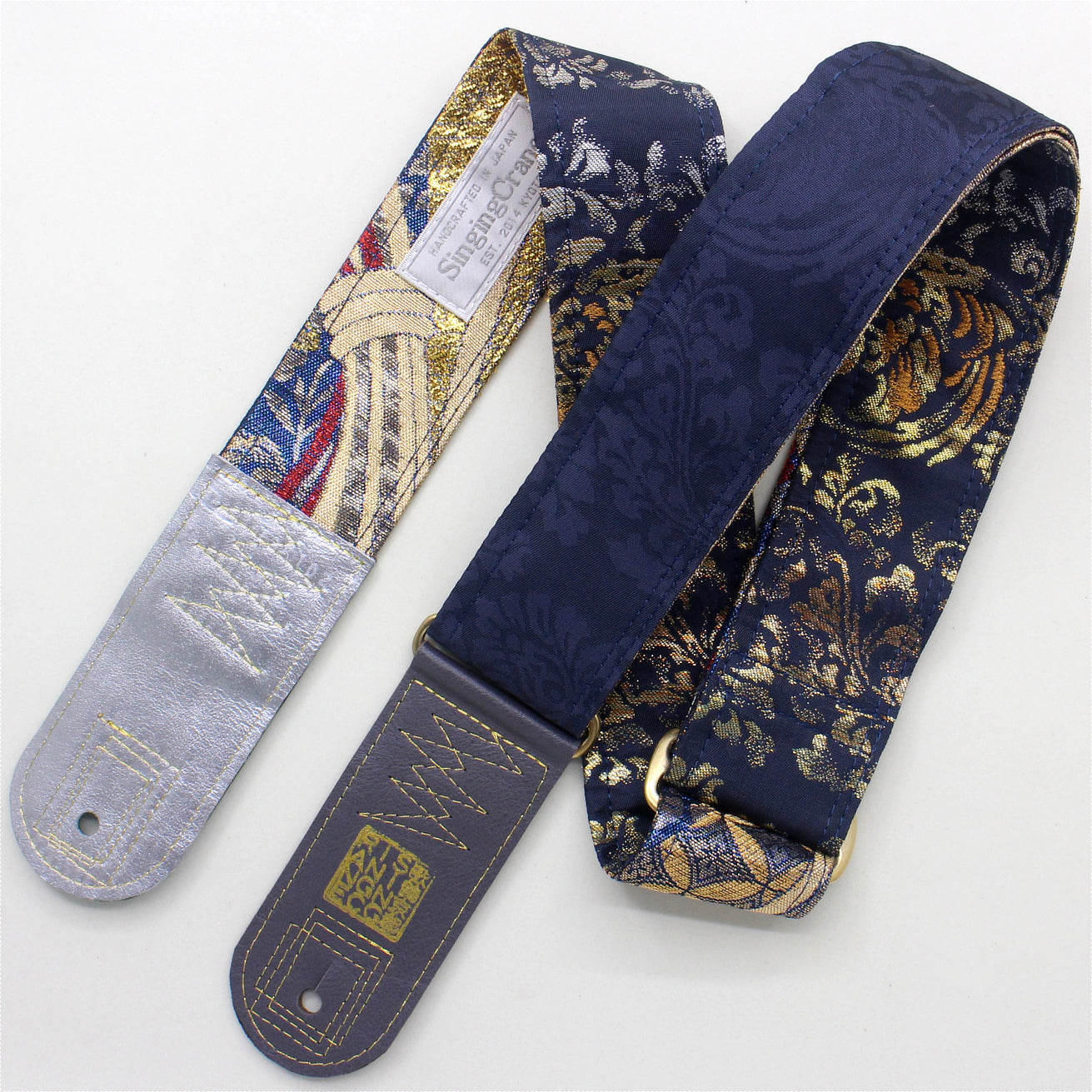 Every Singing Crane strap is one-of-a-kind, one of three variations from the same Obi on the front, and this strap has a gold colour reverse, with hand picked matching leathers and stitching.