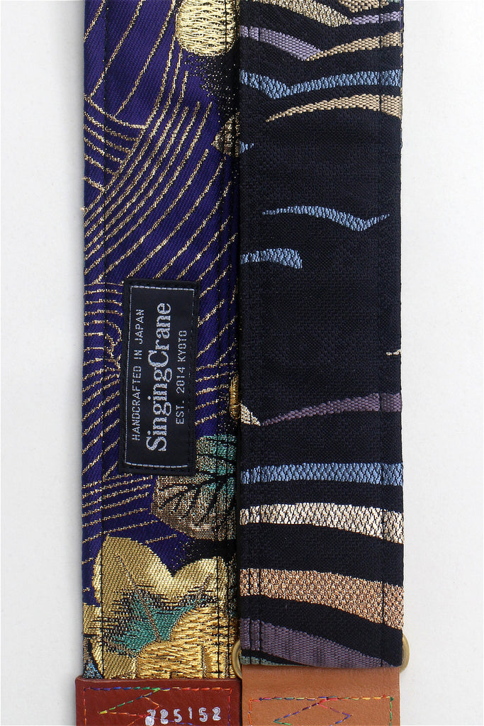 Every Singing Crane strap is one-of-a-kind, one of three variations from the same Obi on the front, and this strap has a navy blue colour reverse, with hand picked matching leathers and stitching.