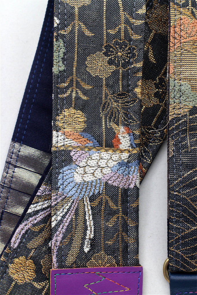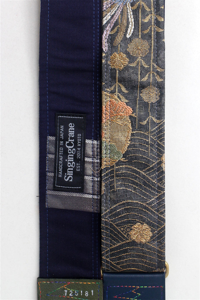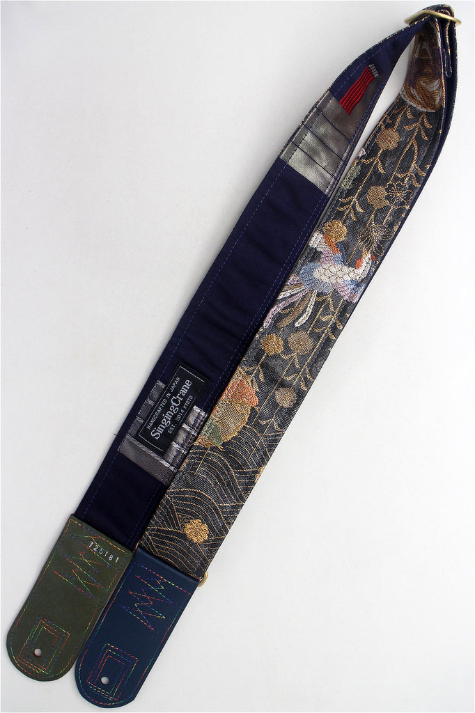 Every Singing Crane strap is one-of-a-kind, one of three variations from the same Obi on the front, and this strap has a dark navy blue colour reverse, with hand picked matching leathers and stitching.