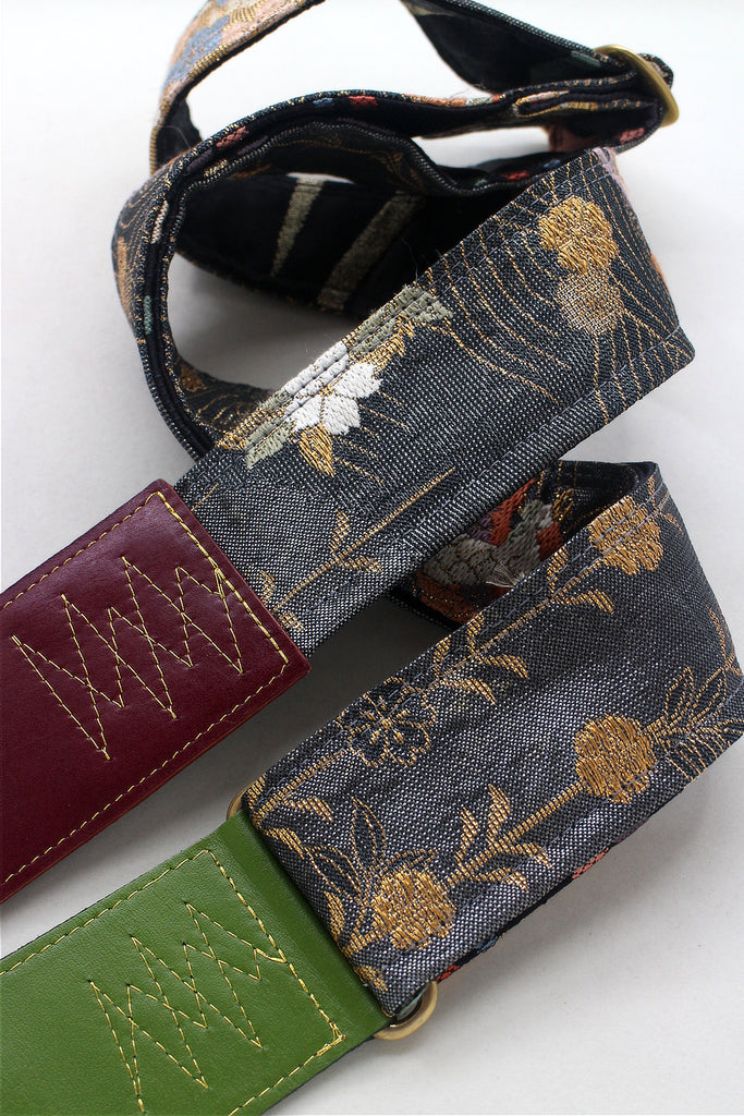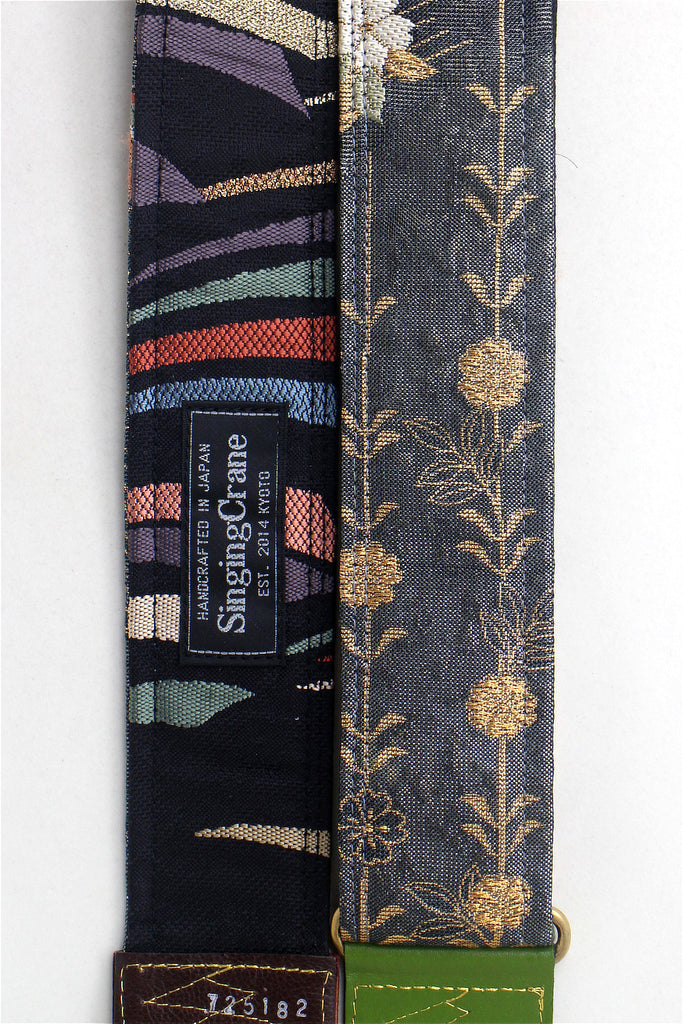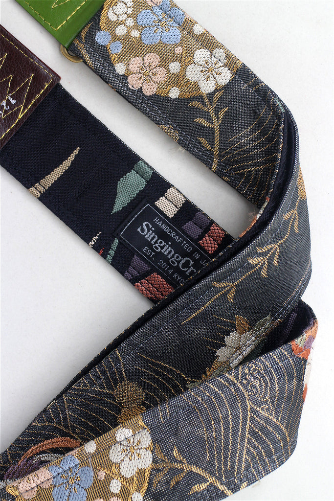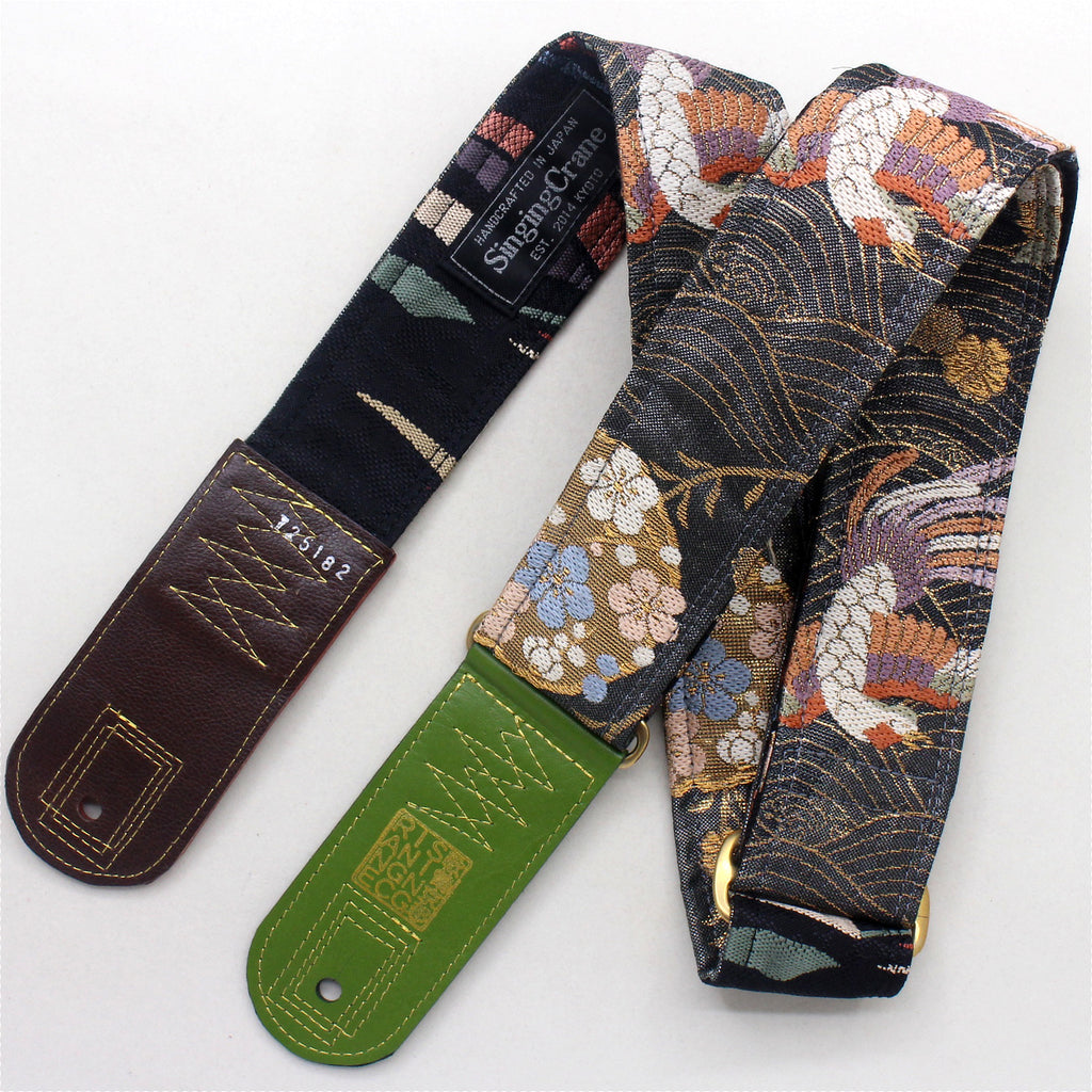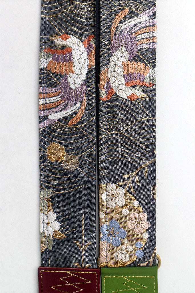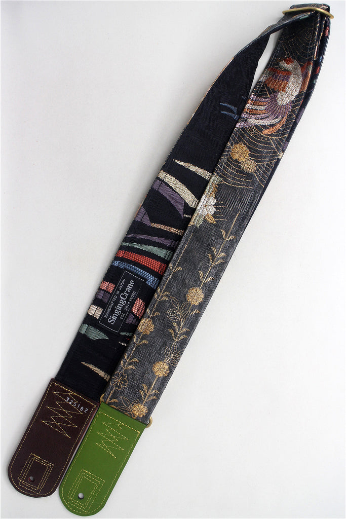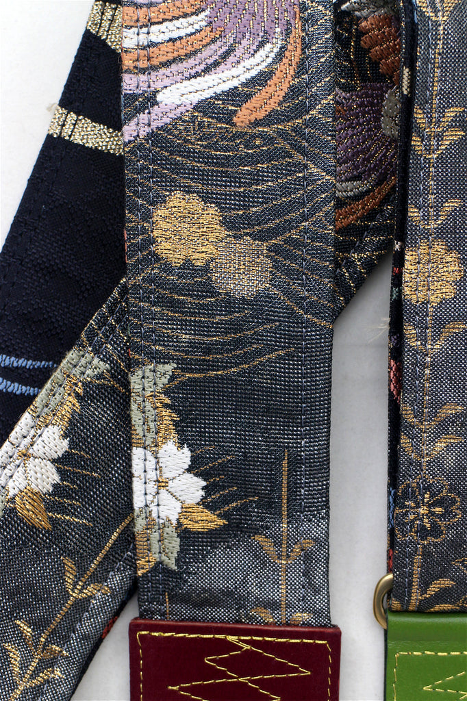 Every Singing Crane strap is one-of-a-kind, one of three variations from the same Obi on the front, and this strap has a black colour reverse, with hand picked matching leathers and stitching.