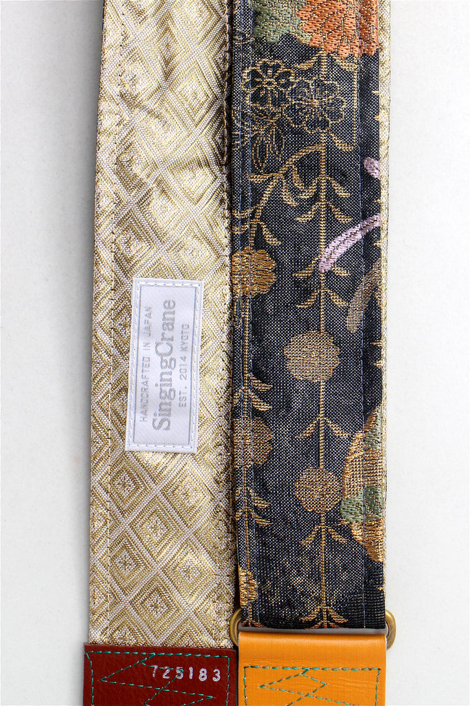 Every Singing Crane strap is one-of-a-kind, one of three variations from the same Obi on the front, and this strap has a gold colour reverse, with hand picked matching leathers and stitching.