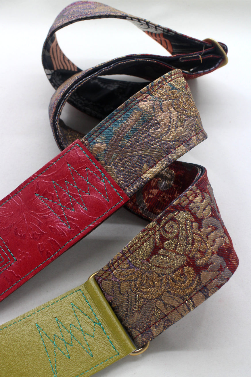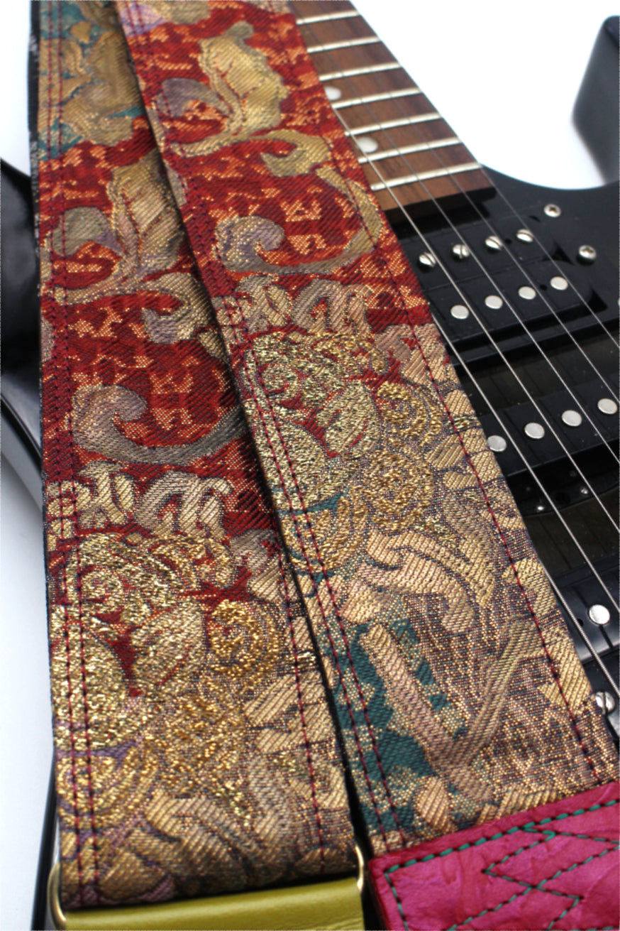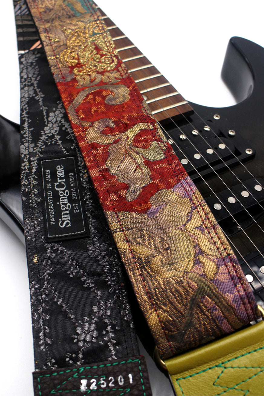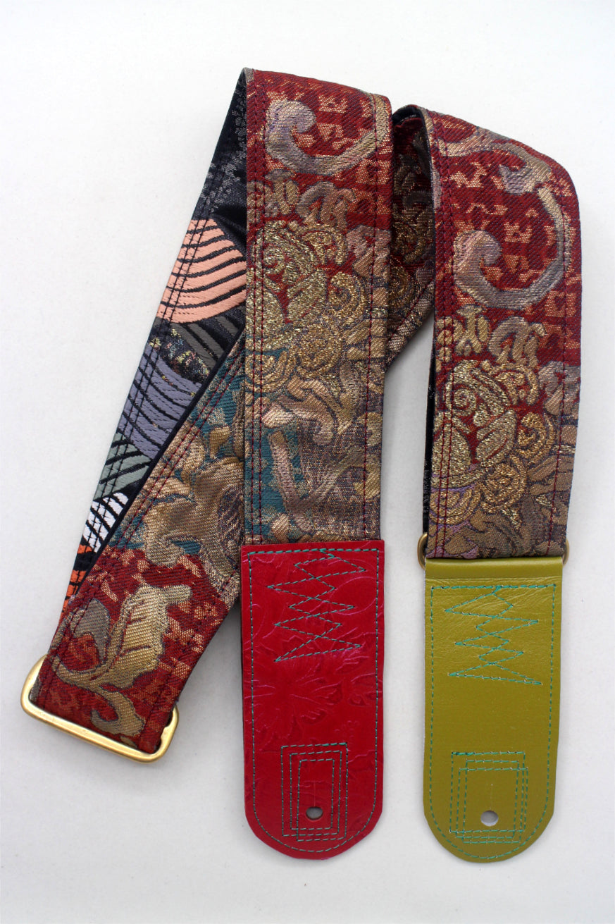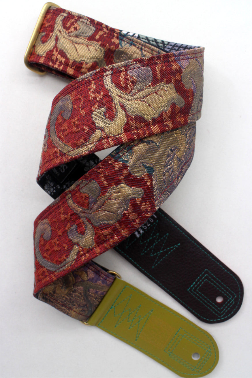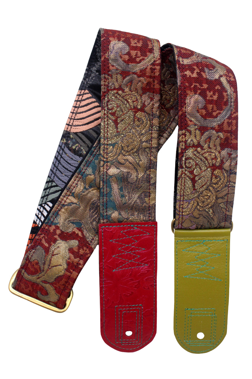 Unique and beautiful guitar strap [SC725201] - hand made in Japan from recycled silk woven kimono obi, leather and brass