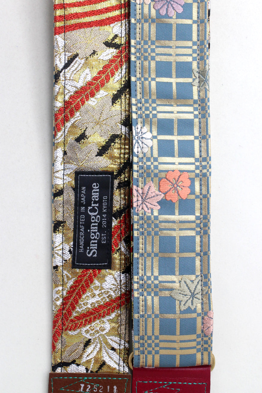 Every Singing Crane strap is one-of-a-kind, one of three variations from the same Obi on the front, and this strap has a gold colour reverse, with hand picked matching leathers and stitching.