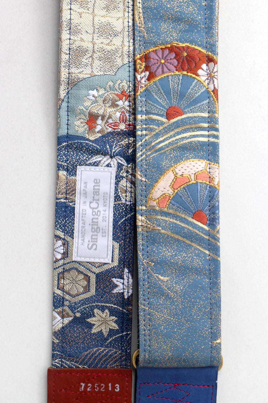 Every Singing Crane strap is one-of-a-kind, one of three variations from the same Obi on the front, and this strap has a french blue colour reverse, with hand picked matching leathers and stitching.