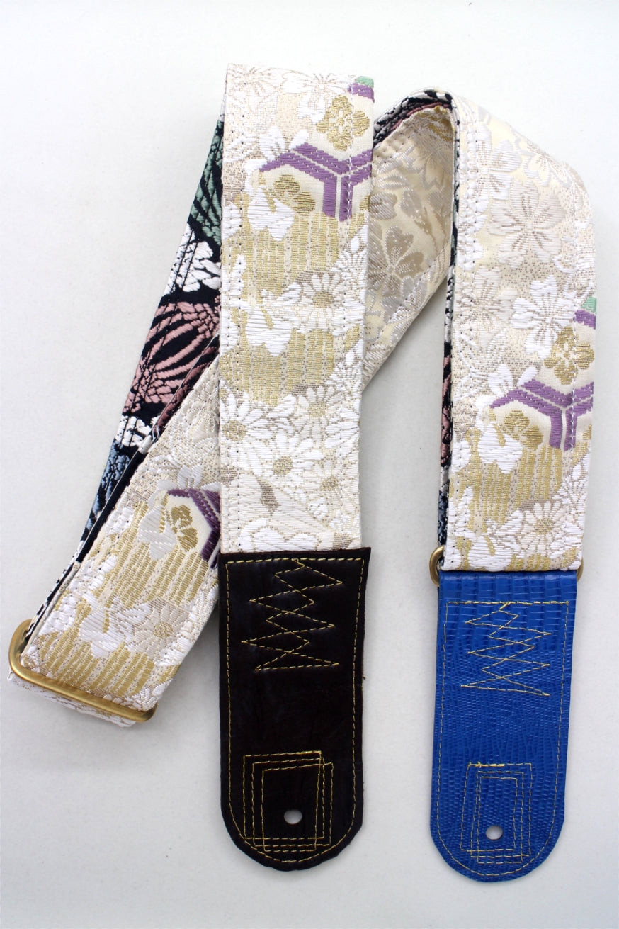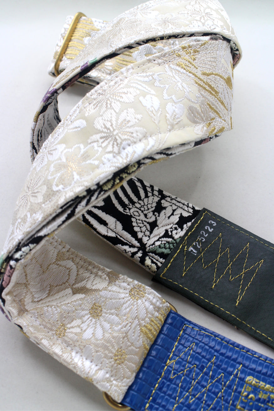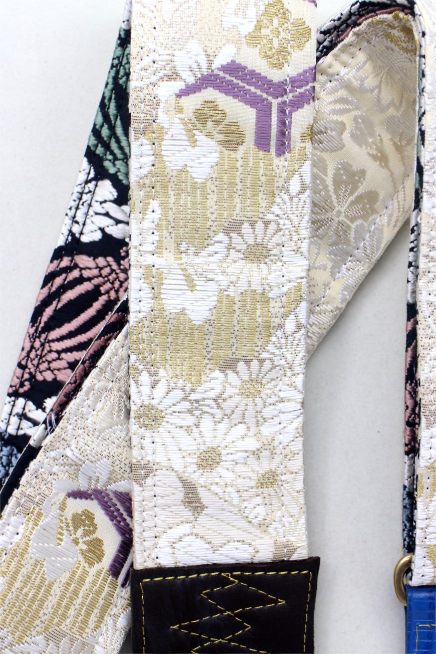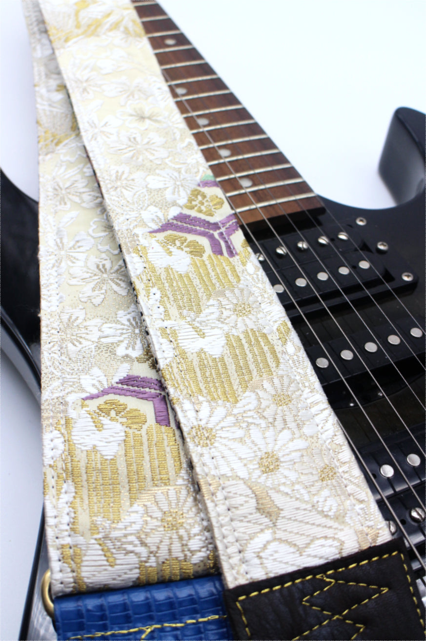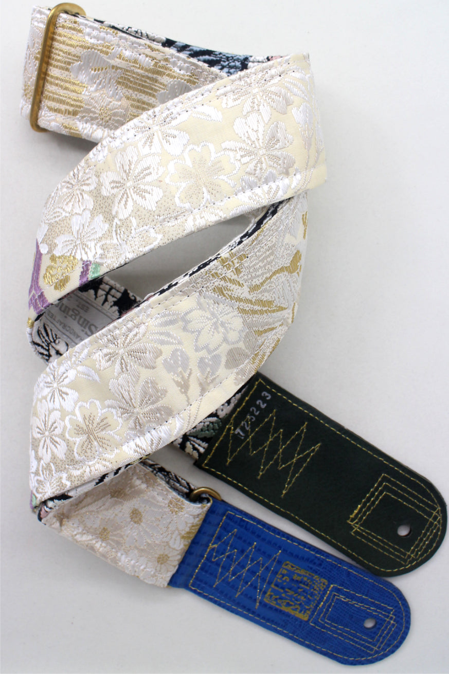 Unique and beautiful guitar strap [SC725223] - hand made in Japan from recycled silk woven kimono obi, leather and brass