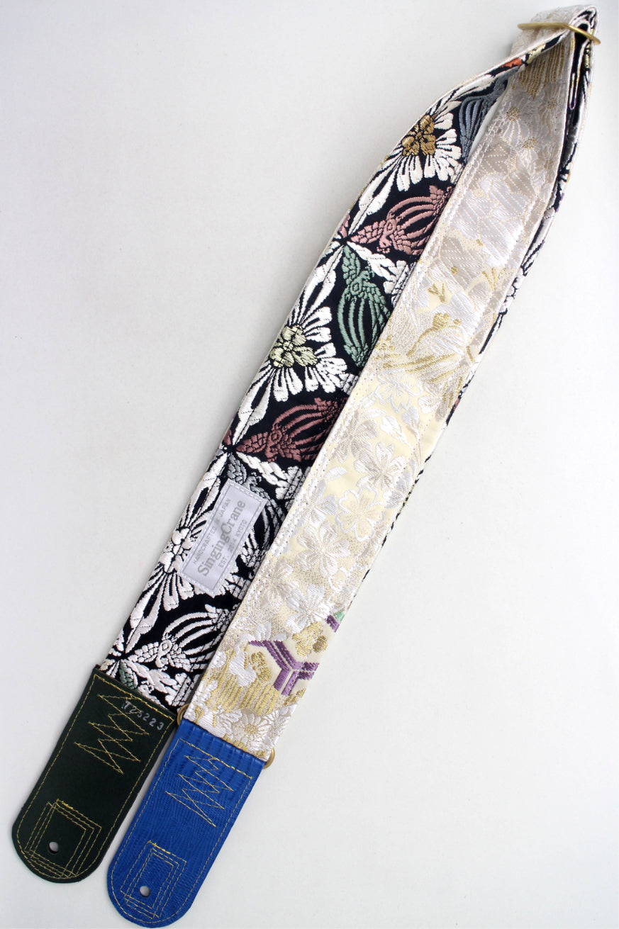 Every Singing Crane strap is one-of-a-kind, one of three variations from the same Obi on the front, and this strap has a black colour reverse, with hand picked matching leathers and stitching.