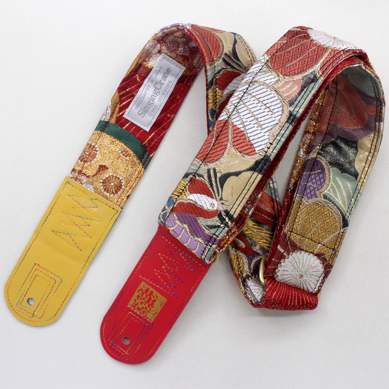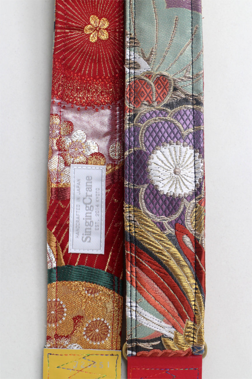 Every Singing Crane strap is one-of-a-kind, one of three variations from the same Obi on the front, and this strap has a red colour reverse, with hand picked matching leathers and stitching.