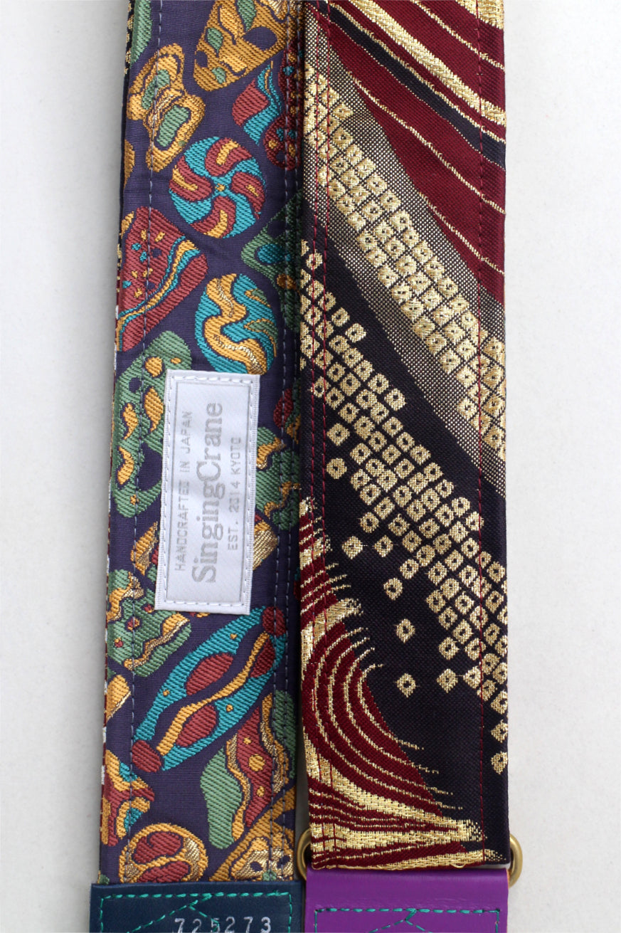 Every Singing Crane strap is one-of-a-kind, one of three variations from the same Obi on the front, and this strap has a deep purple colour reverse, with hand picked matching leathers and stitching.
