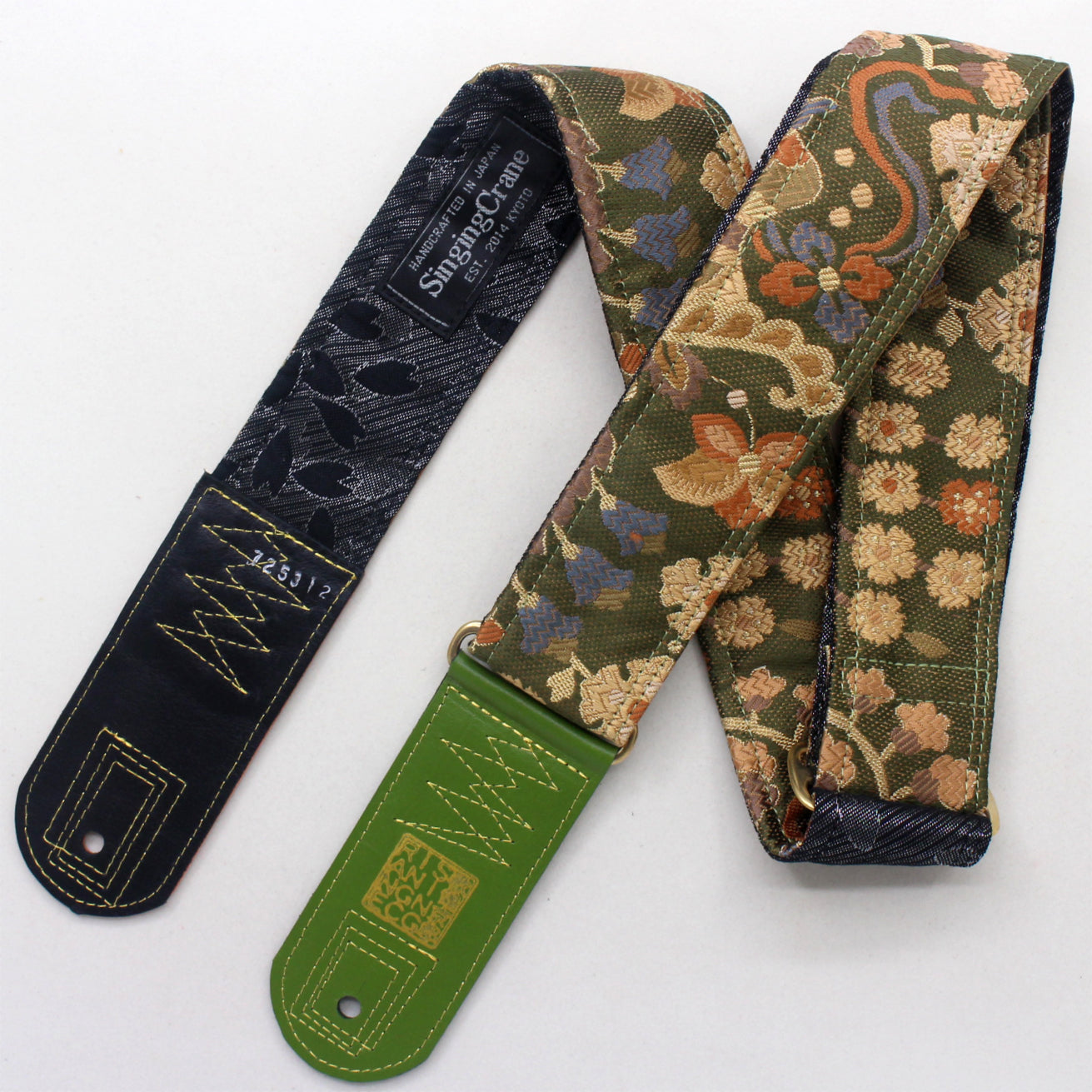 Every Singing Crane strap is one-of-a-kind, one of three variations from the same Obi on the front, and this strap has a black colour reverse, with hand picked matching leathers and stitching.