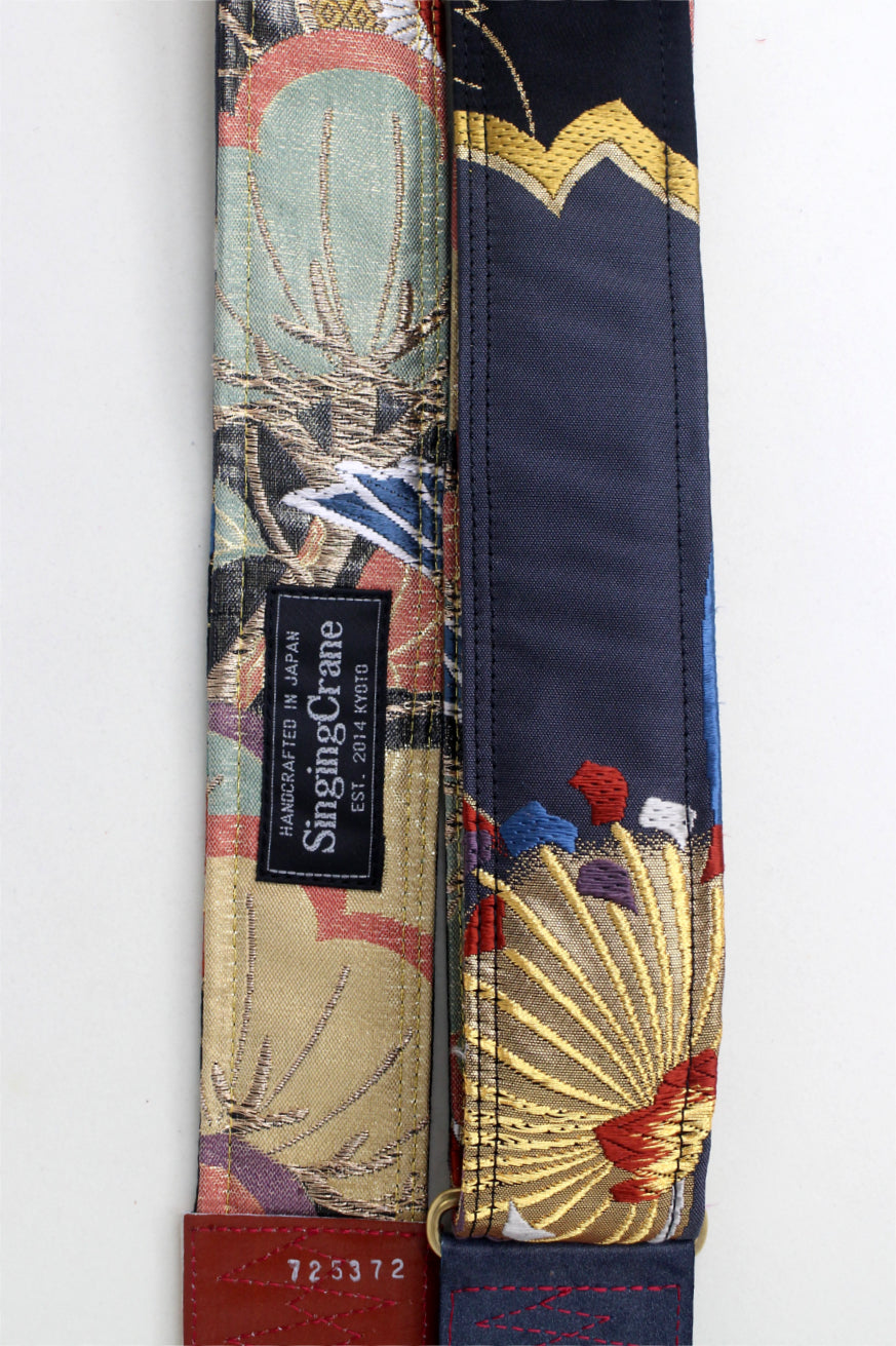 Every Singing Crane strap is one-of-a-kind, one of three variations from the same Obi on the front, and this strap has a gold and turquoise gree colour reverse, with hand picked matching leathers and stitching.